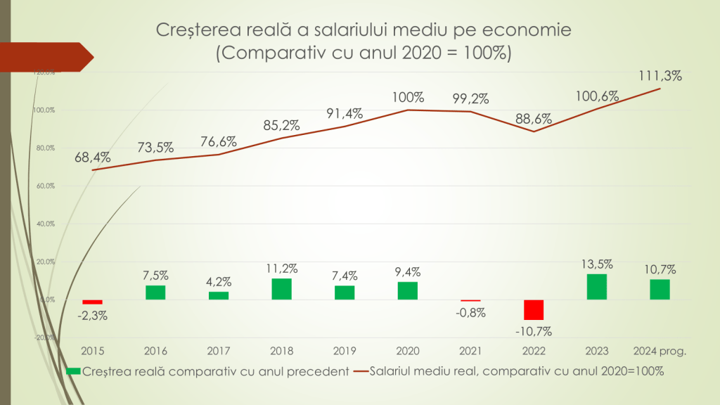 Cu privire la creșterea reală a salariului mediu pe economie, economistul a menționat că în 2015 a fost minus 2,3%; în 2016 – +7,5%; 2017 – +4,2%; 2018 – +11,2%; 2019 – +7,4%; 2020 – +9,4%; 2021 – minus 0,8%; 2022 – minus 10,7%; 2023 – +13,5%; 2024, prognozat – +10,7%. „În 2024, moldovenii, la capitolul venituri, trebuie să simtă că o duc mai bine decât acum câțiva ani”, a menționat economistul.