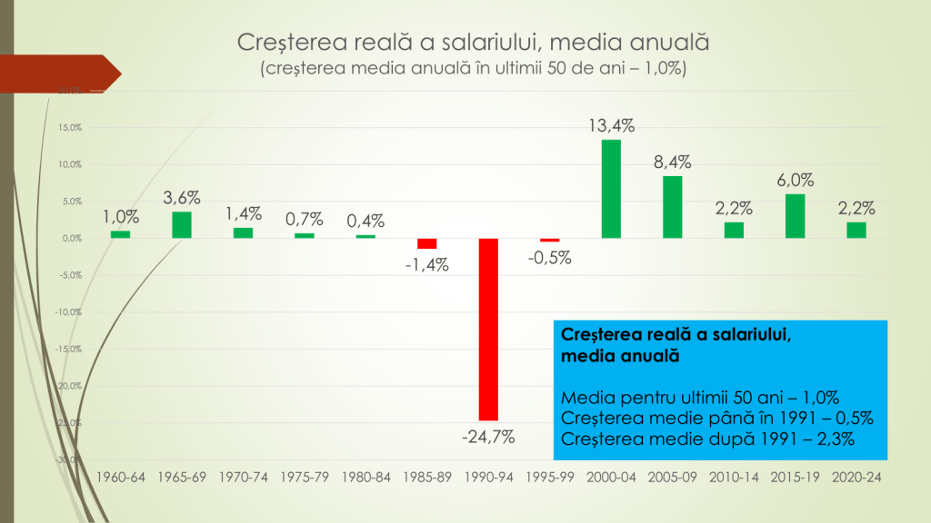 Referitor la creșterea reală a salariilor, media anuală, a afirmat că în perioada 1960/1964 a fost de +1%; 1965/1969 – +3,6%; 1970/1974 – +1,4%; 1975/1979 – +0,7%; 1980/1984 – +0,4%; 1985/1989 – minus 1,4%; 1990/1994 – minus 24,7%; 1995/1999 – minus 0,5%; 2000/2004 – +13,4%; 2005/2009 – +8,4%; 2010/2014 – +2,2%; 2015/2019 – +6%; 2020/2024 – +2,2%. „În ultimii 50 de ani, veniturile reale ale populației au crescut anual cu 1,0%. Până la obținerea independenței în 1991, veniturile reale au crescut în mediu cu 0,5% anual. După 1991 au crescut cu 2,3% anual. Veniturile reale ale populației după independență au crescut mai rapid decât până la independență”, a afirmat economistul.
