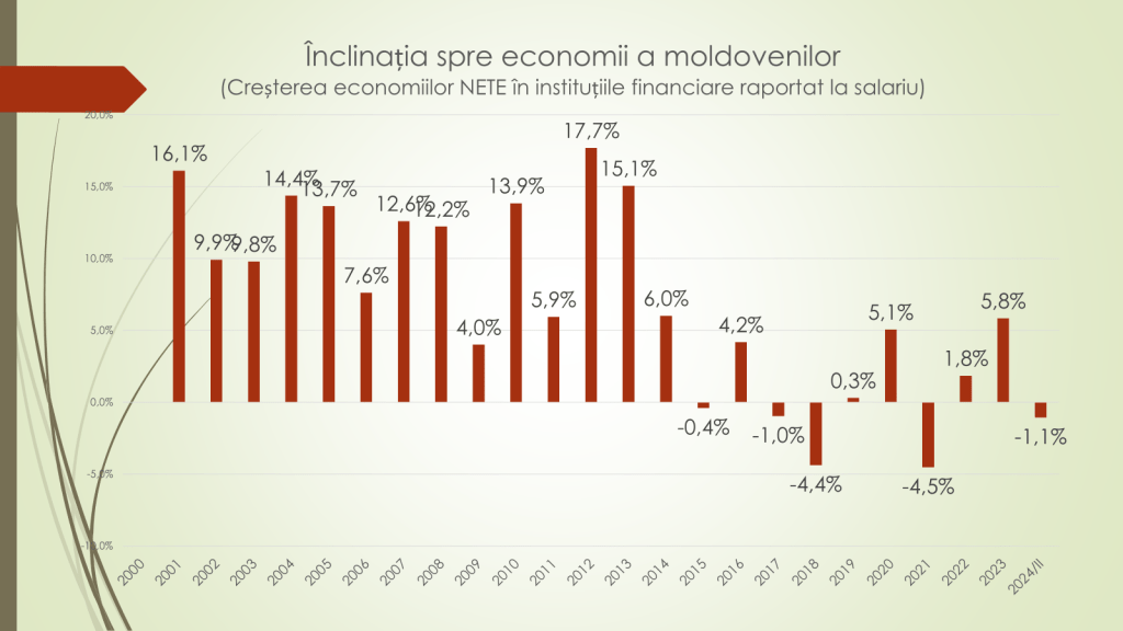 Privind înclinația spre economii a moldovenilor, analistul economic a declarat că în 2001, creșterea economiilor nete, în bănci, raportată la salariu, a fost de 16,1%; în 2002 – de 9,9%; 2004 – 14,4%; 2006 – 7,6%; 2008 – 12,2%; 2009 – 4%; 2010 – 13,9%; 2011 – 5,9%; 2012 – 17,7%; 2014 – 6%; 2015 – minus 0,4%; 2016 – 4,2%; 2017 – minus 1%; 2018 – minus 4,4%; 2019 – +0,3%; 2020 – +5,1%; 2021 – minus 4,5%; 2022 – +1,8%; 2023 – +5,8%; 2024, trimestrul doi – minus 1,1%. „Din 2000 și până în 2014 înclinația spre economii a fost ridicată. După criza bancară din 2014, mediul de afaceri nu prea a fost finanțat. Mai mult populația. Astfel, înclinația spre economii a scăzut puternic. Moldovenii, au cheltuit banii pe care i-au câștigat, dar au luat bani și de la bănci, mai mult decât au câștigat. Și în prezent, înclinația spre economii este negativă. Se cheltuie mai mult decât se câștigă”, a declarat analistul economic.