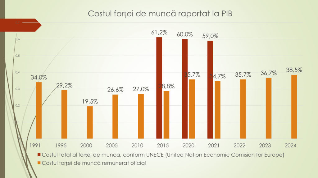 Potrivit expertul, în Republica Moldova este scumpă forța de muncă având în vedere ceea ce produce țara. Dacă costul forței de muncă sub formă de remunerare oficială, raportat la Produsul Intern Brut (PIB), în 1991 a fost de 34%; în 2000 a ajuns la 19,5%; în 2010 – la 27%; 2020 – 37,5%; 2023 – 36,7%; 2024 – 38,5%. „Anterior se spunea că la noi forța de muncă este foarte ieftină, însă forța de muncă din Republica Moldova este dintre cele mai scumpe din Europa. Nu după salariu, dar raportat la PIB. La cât și la ce produce Republica Moldova, moldovenii sunt foarte scumpi. În Republica Moldova, costul forței de muncă, atât din remunerarea oficială, cât și din cea neoficială, este de 60% din PIB. Raportat la cea ce producem, costul forței de muncă din Moldova este aproape de două ori mai scumpă decât în România. Totuși, în prezent, chiar dacă înregistrăm o creștere de salarii, productivitatea muncii crește mai rapid și în consecință, înregistrăm o ușoară scădere a costului forței de muncă raportat la PIB. Noi trebuie să ne creștem productivitatea, care să genereze salarii. La noi, de asemenea, crește ponderea forței de muncă angajată oficial. Lent, economia tenebră trece în economia albă. Din 2017 domină veniturile oficiale”, spune expertul.
