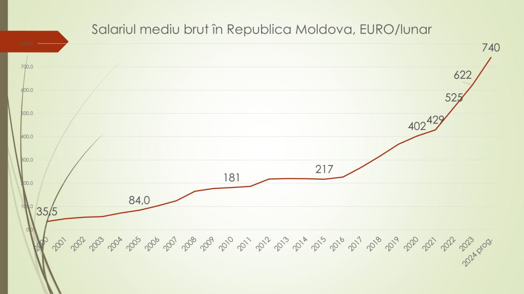 Cu referire la salariul mediu brut, economistul a menționat că în 2000 a fost de 35,3 euro/lunar; în 2005 – 84 euro/lunar; 2010 – 181 euro/lunar; 2015 – 217 euro/lunar; 2020 – 402 euro/lunar; 2023 – 622 euro/lunar; iar în 2024 este prognozat să fie 740 euro/lunar.