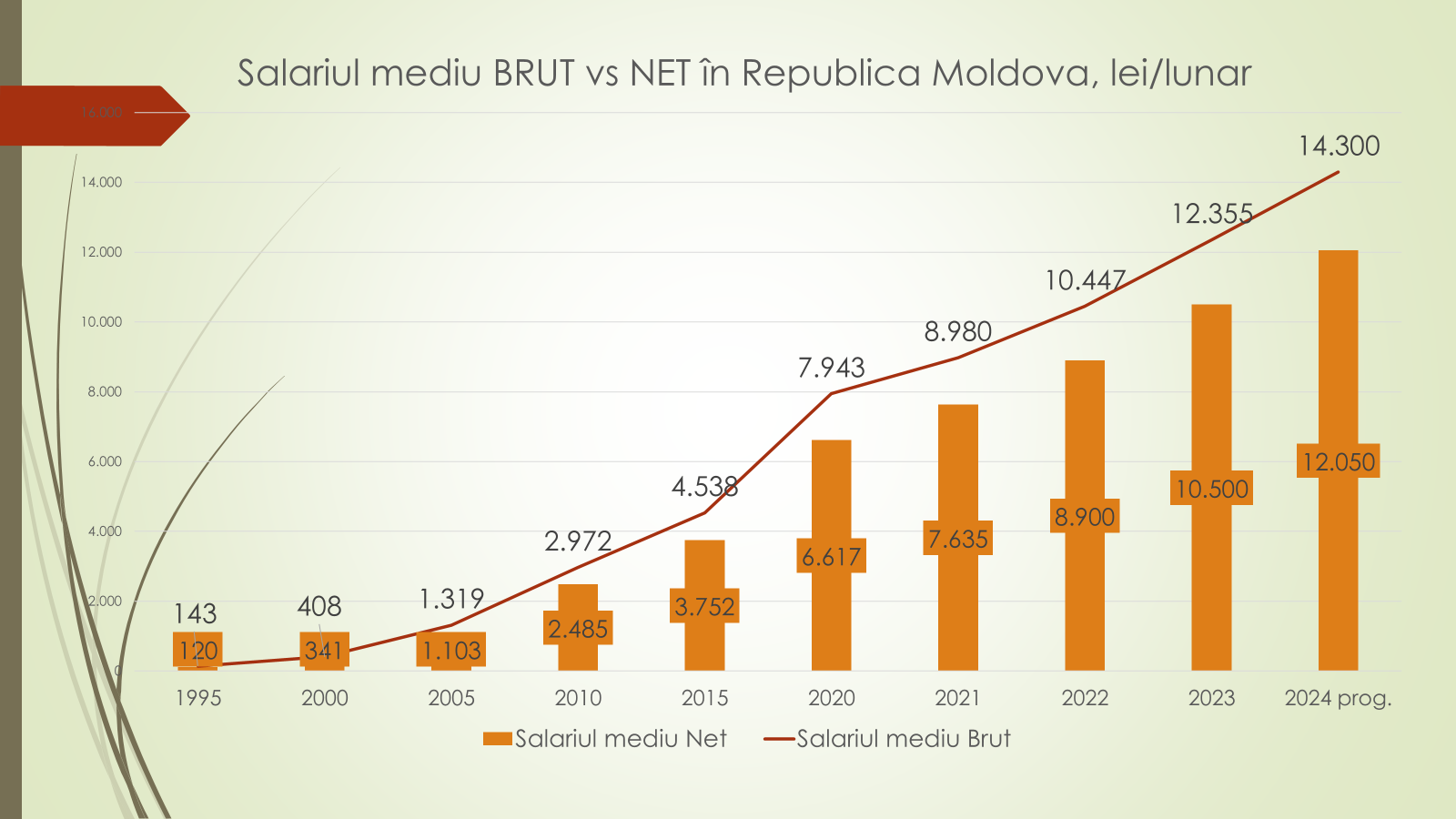 Analizând salariul mediu brut față de salariul mediu net, expertul a spus că se înregistrează diferențe. Dacă în 2015, salariul mediu net a fost de 3752 de lei, cel brut a fost de 4538 de lei. În 2020, salariul mediu net a fost de 6617 lei, cel brut – 7943 de lei. În 2023, salariul mediu net – 10500 lei, salariu mediu brut – 12355 de lei. În 2024 anticipăm că salariul mediu net va ajunge la 12050 lei, salariu mediu brut – 14300 lei.