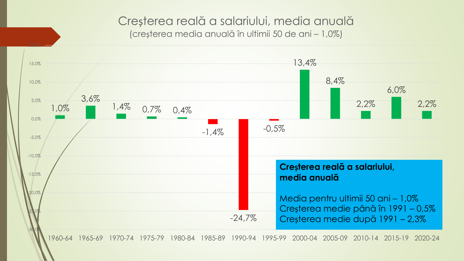 Referitor la creșterea reală a salariilor, media anuală, a afirmat că în perioada 1960/1964 a fost de +1%; 1965/1969 – +3,6%; 1970/1974 – +1,4%; 1975/1979 – +0,7%; 1980/1984 – +0,4%; 1985/1989 – minus 1,4%; 1990/1994 – minus 24,7%; 1995/1999 – minus 0,5%; 2000/2004 – +13,4%; 2005/2009 – +8,4%; 2010/2014 – +2,2%; 2015/2019 – +6%; 2020/2024 – +2,2%. „În ultimii 50 de ani, veniturile reale ale populației au crescut anual cu 1,0%. Până la obținerea independenței în 1991, veniturile reale au crescut în mediu cu 0,5% anual. După 1991 au crescut cu 2,3% anual. Veniturile reale ale populației după independență au crescut mai rapid decât până la independență”, a afirmat economistul.