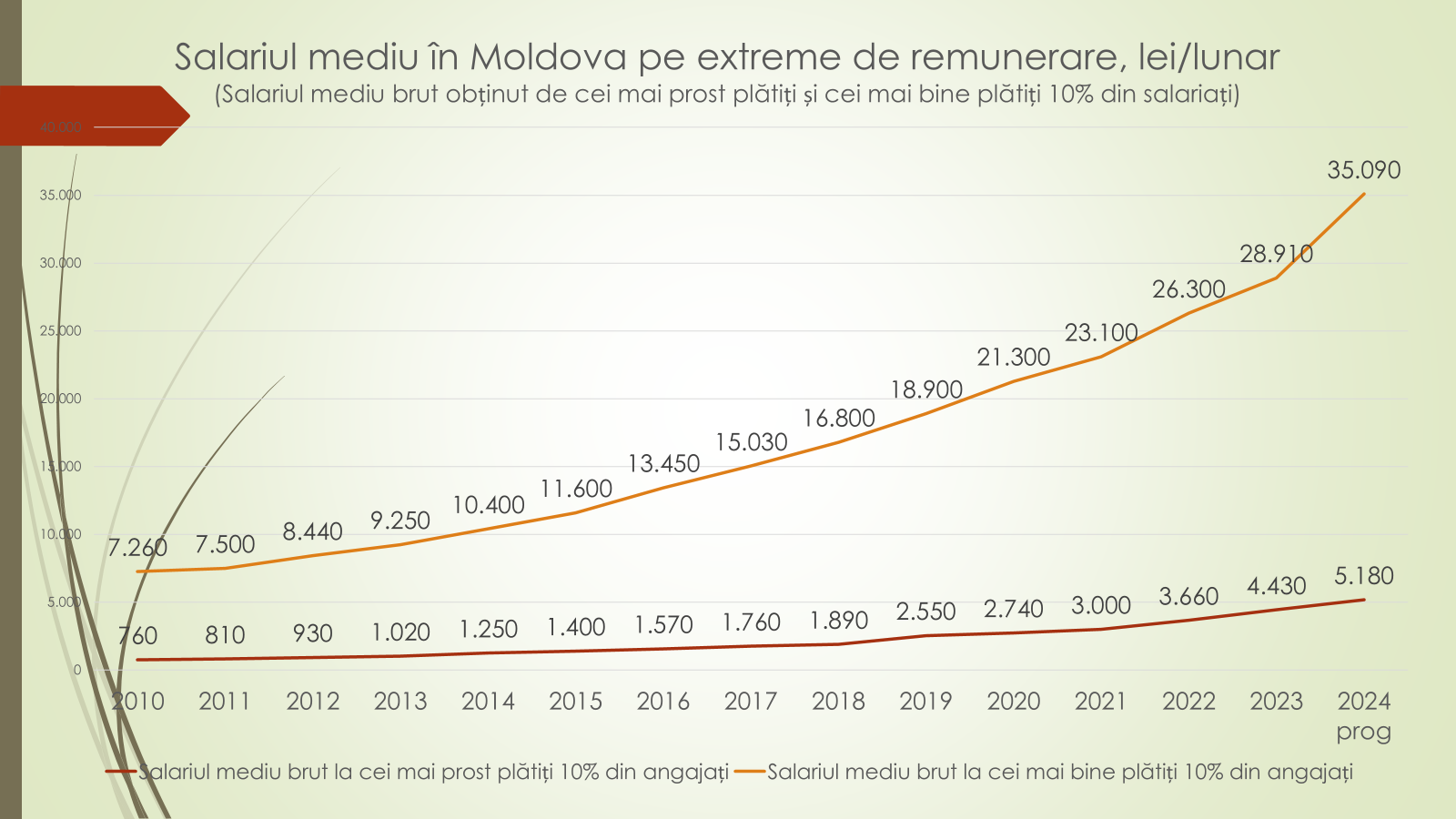 Veaceslav Ioniță, analizând salariul mediu brut din Republica Moldova pe extreme de remunerare, a constatat că în 2010 a fost de 760 de lei salariul mediu brut obținut de cei mai prost plătiți angajați și de 7260 de lei a fost salariul mediu brut obținut de cei mai bine plătiți 10% dintre salariați. În 2015: 1400 de lei a fost salariul celor mai prost plătiți salariați și 11600 de lei – salariul celor mai bine plătiți 10% dintre salariați. 2020: 2740 de lei – salariul mediu brut obținut de cei mai prost plătiți și de 21300 de lei – salariul mediu brut obținut de cei mai bine plătiți 10% dintre salariați; 2024, prognozat: 5180 de lei – salariul mediu brut obținut de cei mai prost plătiți și de 35090 de lei – salariul mediu brut obținut de cei mai bine plătiți 10% dintre salariați. „O diferență de 7 ori”, a declarat Veaceslav Ioniță.