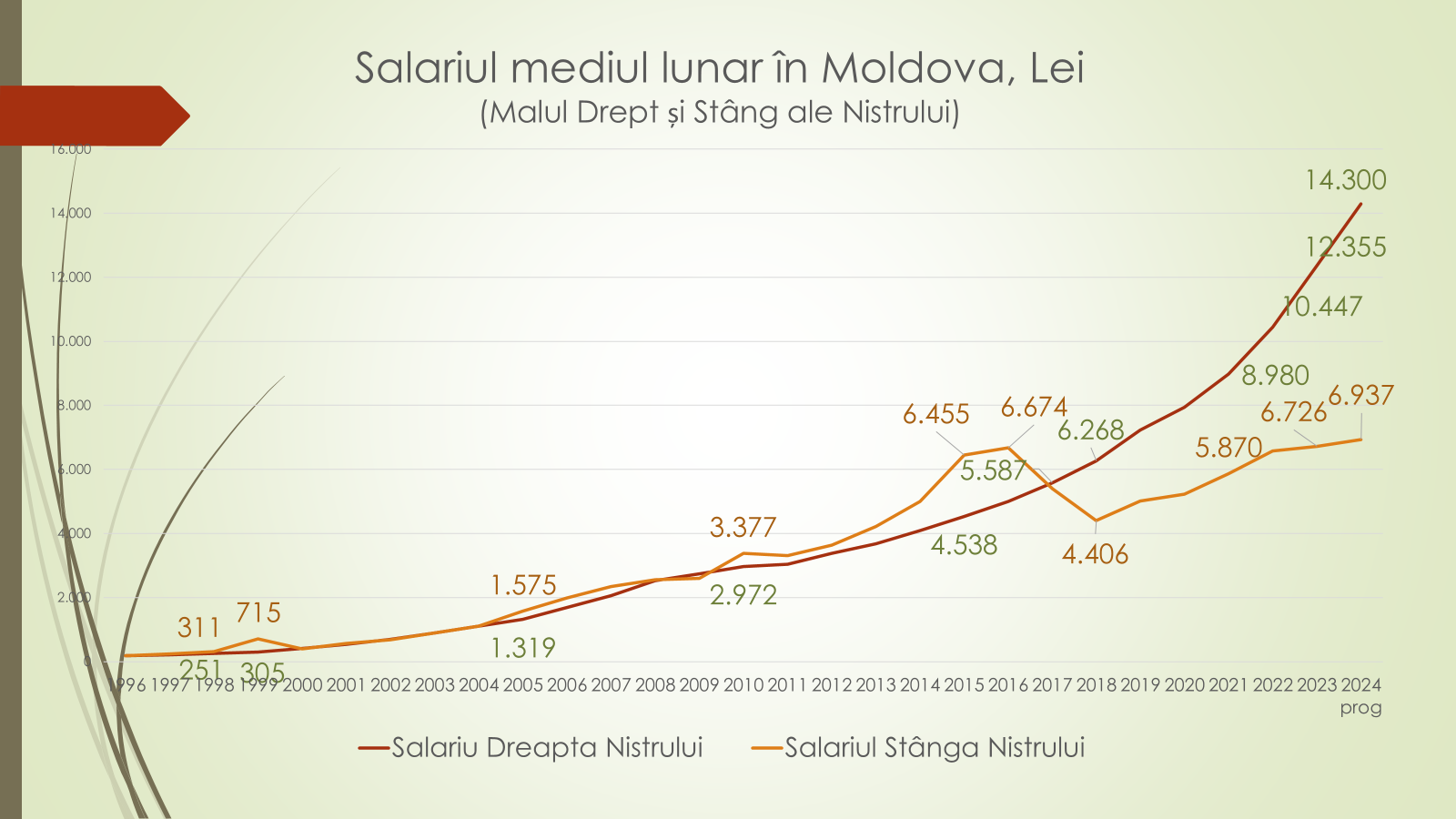 Despre salariul mediul lunar, economistul a afirmat că în 2005 a fost de 1319 lei pe malul drept al Nistrului și de 1575 în regiunea separatistă transnistreană. 2010: 2972 pe malul drept și 3377 pe malul stâng; 2015: 4538 pe malul drept, 6674 pe malul stâng; 2023: 6726 pe malul stâng, 12355 pe malul drept, 2024 este prognozat să fie 6937 pe malul stâng și 14300 pe malul drept. „În dreapta Nistrului, în acest an, salariul va fi de două ori mai mare decât în stânga Nistrului”, a afirmat economistul.