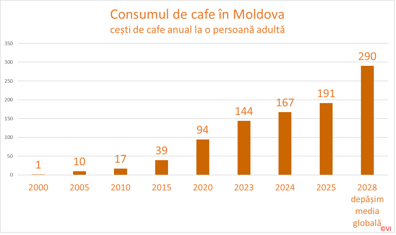 În ultimii 10 ani, consumul de cafea în Moldova a cunoscut o creștere spectaculoasă, de 18% anual per adult. Dacă în anul 2000 un moldovean consuma în medie o singură ceașcă de cafea pe an, în 2024, această cifră a ajuns la 167 de cești. Această schimbare reflectă nu doar o ajustare a preferințelor de consum, dar și o evoluție economică și culturală, în contextul urbanizării și creșterii veniturilor disponibile.