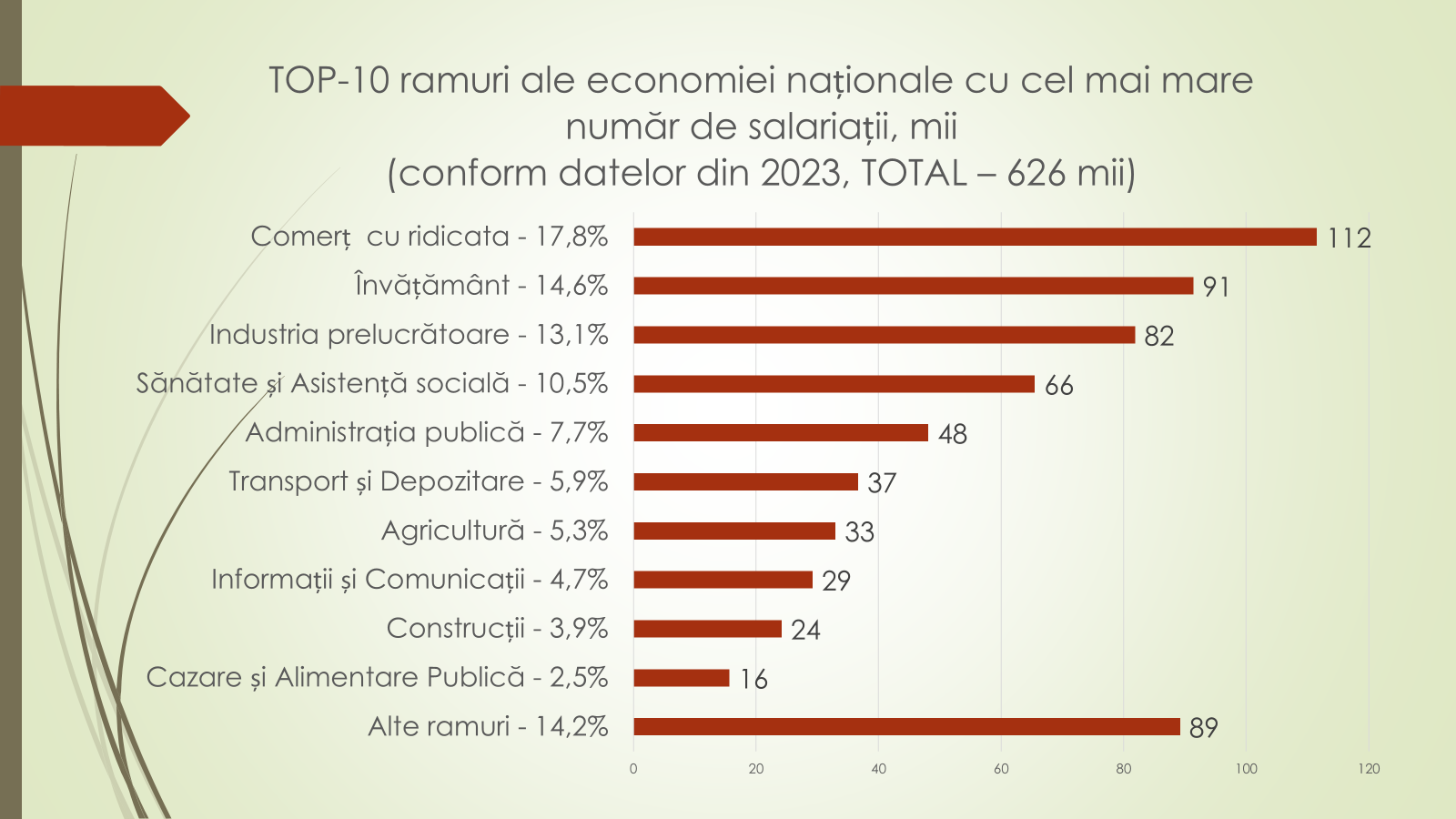 Potrivit lui Veaceslav Ioniță, dintre ramurile economiei naționale cu cel mai mare număr de salariații, ramura învățământului este cea mai mare ramură din sectorul bugetar care are cei mai mulți salariați și a doua din economia națională. Comerțul cu ridicata are 112 mii de persoane sau 17,8%; învățământul – 91 de mii sau 14,6%; industria prelucrătoare – 82 de mii (13,1%); sănătate și asistență socială – 66 de mii (10,5%); iar administrația publică – 48 de mii (7,7%).