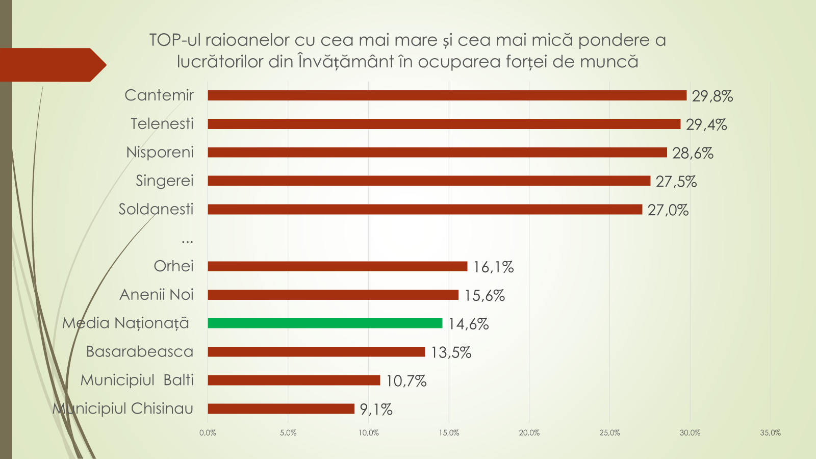 În 2023, raioanele cu cea mai mare pondere a lucrătorilor în învățământ au fost Cantemir – 29,8%; Telenești – 29,4%; Nisporeni – 28,6%; Sângerei – 27,5%; Șoldănești – 27%, iar raioanele cu cea mai mică pondere a lucrătorilor în învățământ au fost Orhei – 16,1%; Anenii Noi – 15,6%; Basarabeasca – 13,5%; municipiul Bălți – 10,7%; iar municipiul Chișinău – 9,1%. Media națională a fost de 14,6%. „În raioanele unde profesorii sunt fiecare al treilea cetățean practic nu există activitate economică, nu există locuri de muncă, iar profesorii sunt unicii care lucrează. Acolo unde profesorii sunt mai puțini, acolo oamenii au și alte domenii de muncă”, a spus Veaceslav Ioniță.
