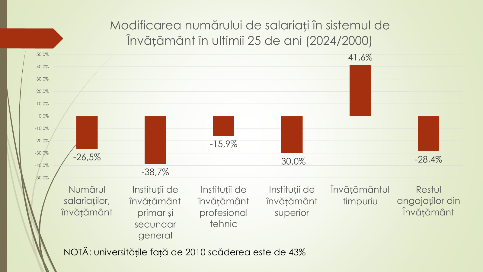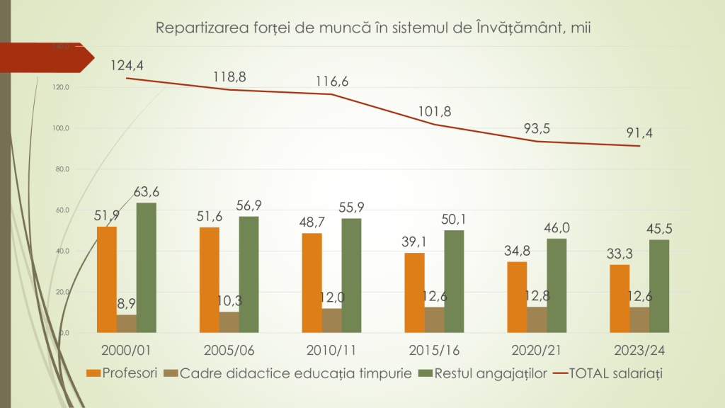 Repartizând forța de muncă din sistemul de învățământ, expertul a declarat că în anul de studiu 2000/2001 au fost 124,4 mii de angajați, dintre care: 51,9 mii – învățători și profesori; 8,9 mii – educatori; 63,6 mii reprezentau restul angajaților din sistem. În 2010/2011 – 116,6 mii de angajați: 48,7 mii – învățători și profesori; 12 mii – educatori; 55,9 mii – restul angajaților. 2020/2021 – 93,5 mii de angajați: 34,8 mii – învățători și profesori; 12,8 mii – educatori; 46 mii – restul agajaților. 2023/2024 – 91,4 mii de angajați: 33,3 mii – învățători și profesori; 12,6 mii – educatori; 45,5 mii – restul angajaților din sistem.