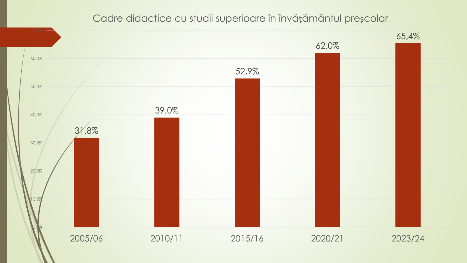 Despre educatorii cu studii superioare din învățământul preșcolar, expertul a specificat faptul că în anul de învățământ 2005/2006 au reprezentat 31,8% din tot sistemul; 2015/2016 – 52,9%; iar în 2023/2024 – 65,4%. „Cândva unul din trei educatori avea studii superioare, astăzi 1 din 3 nu are studii superioare. O situație benefică sistemului educațional preșcolar”, a specificat expertul.
