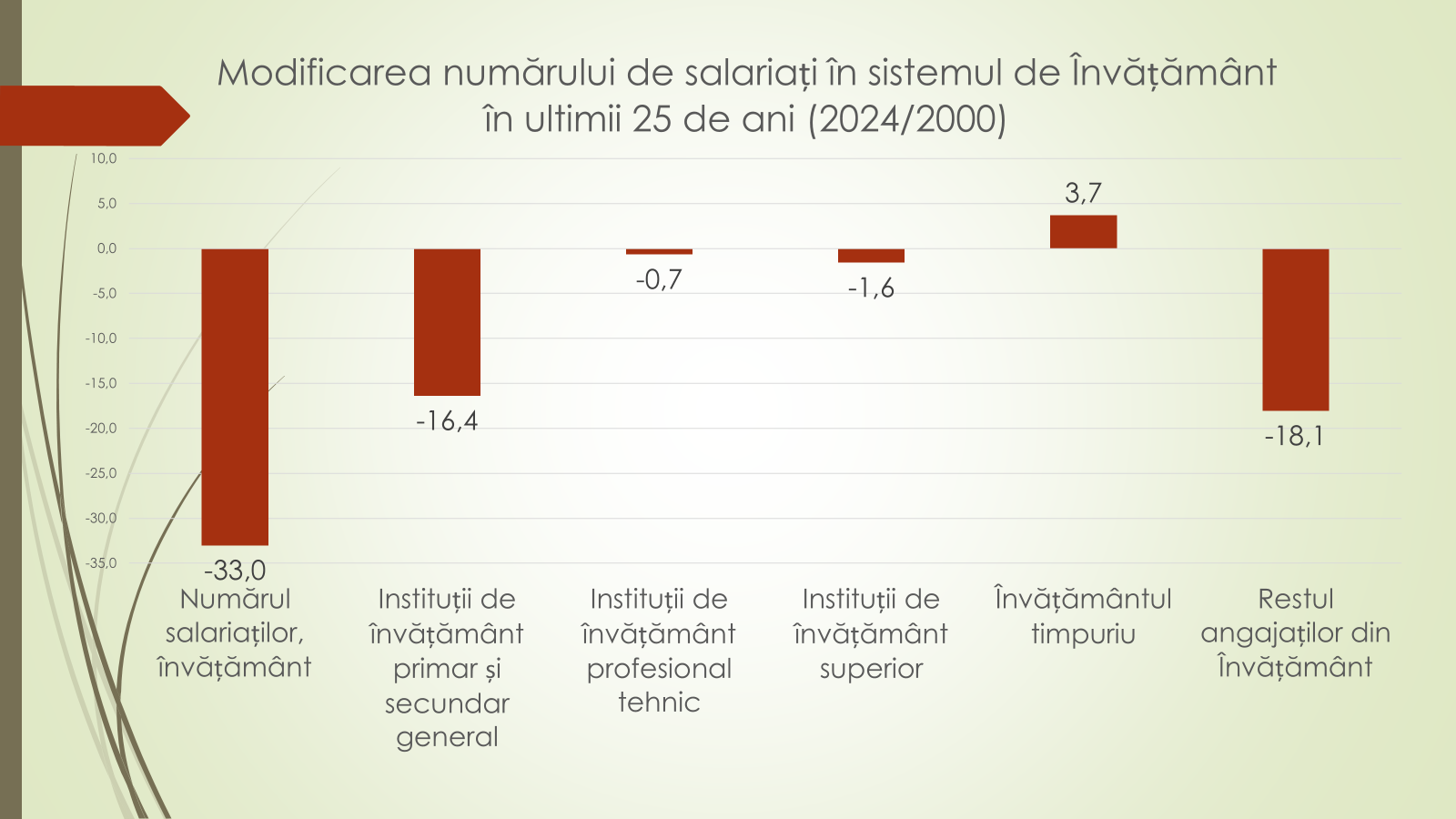 Economistul a menționat că în ultimii 25 de ani, numărul salariaților din învățământ a scăzut cu 33 de mii sau cu 26,5%. Cel mai mult a scăzut în instituțiile de învățământ primar și secundar general cu 16400 mii sau cu 38,7%. Din instituțiile de învățământ superior s-a redus cu 1600 mii (30%); din instituțiile de învățământ profesional tehnic – cu 700 (15,9%). Restul angajaților din învățământ a scăzut cu 18100 (28,4%). Pe de altă parte, numărul salariaților în instituțiile de învățământ preșcolar a crescut cu 3700 de persoane sau cu 41,6%.