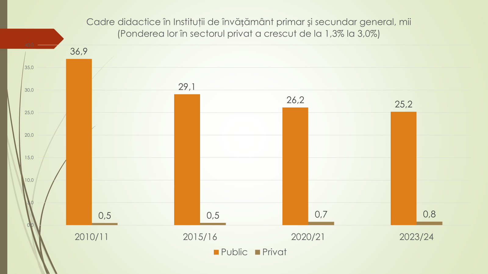 Analistul economic, analizând numărul învățătorilor din instituțiile de învățământ primar şi secundar general, a afirmat că în anul de studiu 2010/2011 a fost de 36,9 mii în învățământul public și de 500 în cel privat. În anul 2015/2016 – 29,1 mii în învățământul public și 500 în cel privat. 2020/2021 – 26,2 mii în învățământul public și 700 în cel privat. 2023/2024 – 25,2 mii în învățământul public și 800 în cel privat. „Ponderea celor din învățământul privat a crescut cu 300 de persoane. În sectorul bugetar numărul profesorilor a scăzut cu 11700 de persoane”, a afirmat analistul economic.