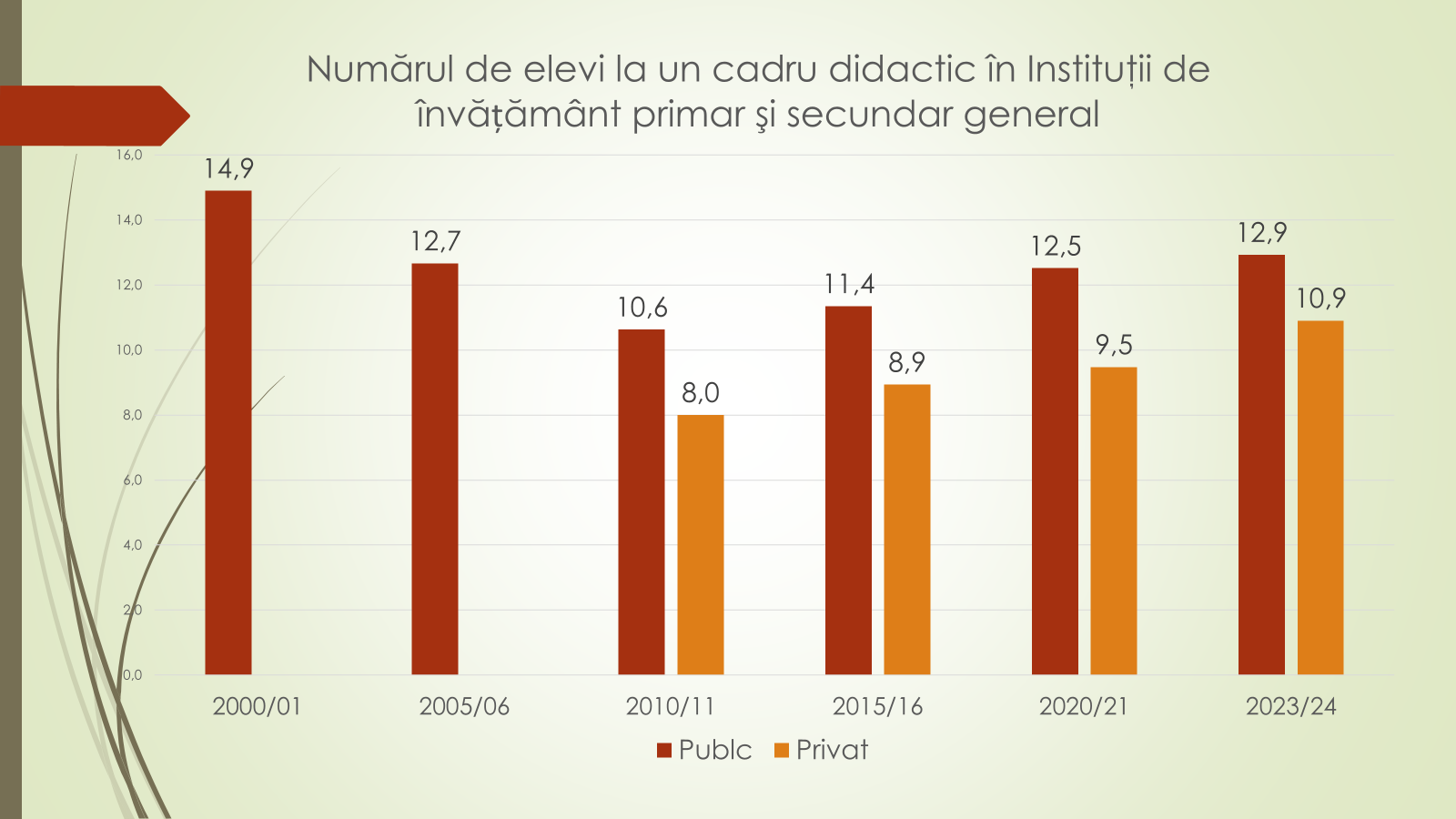 Vorbind despre numărul de elevi la un învățător în învățământ primar şi secundar general, expertul a declarat că în anul de învățământ 2000/2001 erau 14,9 copii la un învățător; în anul 2005/2006 – 12,7 copii per învățător. În 2010/2011 – în învățământul public-10,6 copii/învățător, în învățământul privat-8 copii/învățător. 2015/2016 – în învățământul public-11,4 copii, în cel privat-8,9 copii. 2020/2021 – în învățământul public-12,5 copii, în cel privat-9,5 copii. 2023/2024 – în învățământul public-12,9 copii, în cel privat-10,9 copii. „Numărul învățătorilor s-a redus, dar numărul copiilor și mai mult. Optimizările care au avut loc în cazul instituțiilor de învățământ au permis că numărul copiilor la un învățător totuși să crească. După toate eforturile depuse în ultimii 15 ani, nu reușim să ajungem la nivelul anilor 2000, când erau 14,9 copii la un învățător”, a declarat expertul.