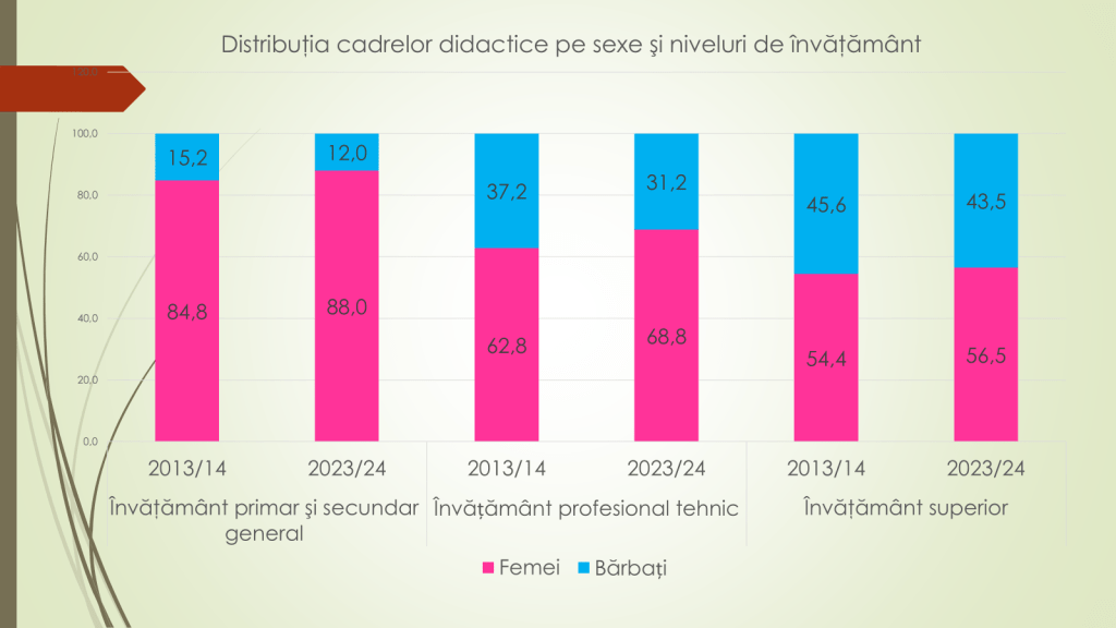 Distribuind cadrele didactice pe sexe şi niveluri de învăţământ, Veaceslav Ioniță a spus că în învățământul primar și secundar general, în 2013 au fost bărbați 15,2%, femei – 84,4%, iar în 2023 numărul bărbaților angajați în învățământul primar și secundar general a scăzut la 12%, iar cel al femeilor a crescut la 88%. În învățământul profesional tehnic, în 2013 bărbați au fost 37,2%; femei – 62,8%; iar în 2023, numărul bărbaților profesori a scăzut la 31,2%, iar al femeilor a crescut la 68,8%. În învățământul superior, în 2013 erau angajați 45,6% de bărbați, femei – 54,4%; în 2023 numărul bărbaților a scăzut la 43,5%, iar cel al femeilor a crescut la 56,5%. „Povara educației în Republica Moldova, atât acasă, cât și la școală, este pe umerii femeilor. Numărul bărbaților implicați în procesul educațional scade. Se atestă totuși că bărbații sunt mai mulți la treptele înalte de învățământ. Unul din 10 profesori sunt bărbați, restul sunt femei”, a spus Veaceslav Ioniță.