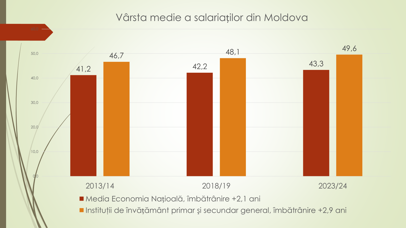 Economistul a mai menționat că în anul de învățământ 2013/2014 vârsta medie a angajaților din economia națională a fost de 41,2 ani, iar a celor din învățământul primar și secundar general – 46,7 ani. În anul 2018/2019, vârsta medie a angajaților din economie a fost de 42,2 ani, iar a celor din învățământul primar și secundar general – 48,1 ani. În 2023/2024, vârsta medie a angajaților din economie a fost de 43,3 ani, iar a celor din învățământul primar și secundar general – 49,6 ani. „În Republica Moldova crește vârsta medie a profesorilor. În anul de învățământ 2024/2025 cel mai probabil vârsta medie a unui profesor va fi de 50 de ani. Într-un an, doi, va depăși 50 de ani. În 10 ani, vârsta medie a unui lucrător din economia națională a crescut cu 2, 1 ani, din învățământ – cu 2,9 ani”, a menționat economistul.