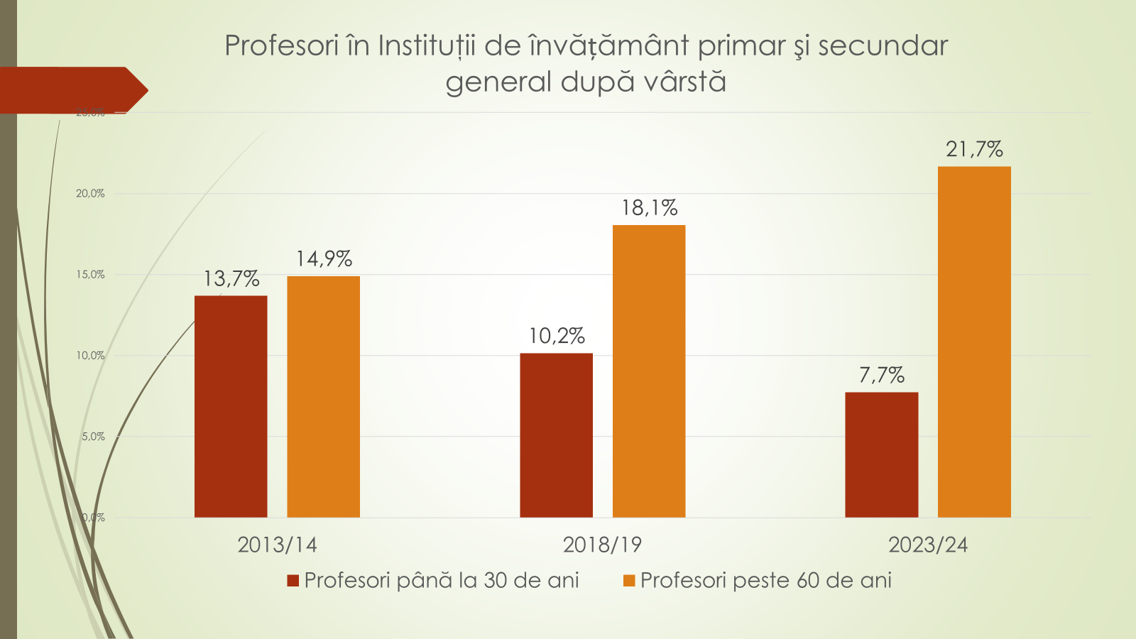 Potrivit analistului economic, în anul de studiu 2013/2014, profesori până la 30 de ani erau 13,7%, iar peste 60 de ani – 14,9%. În anul 2018/2019: până la 30 de ani – 10,2%, iar peste 60 de ani – 18,1%. În 2023/2024: până la 30 de ani – 7,7%, iar peste 60 de ani – 21,7%. „În zece ani s-a înregistrat o scădere de două ori a profesorilor de până la 30 de ani. O dată la 5 ani crește cu 4% ponderea profesorilor care au peste 60 de ani. La noi dispare noțiunea de profesor tânăr”, potrivit analistului economic.