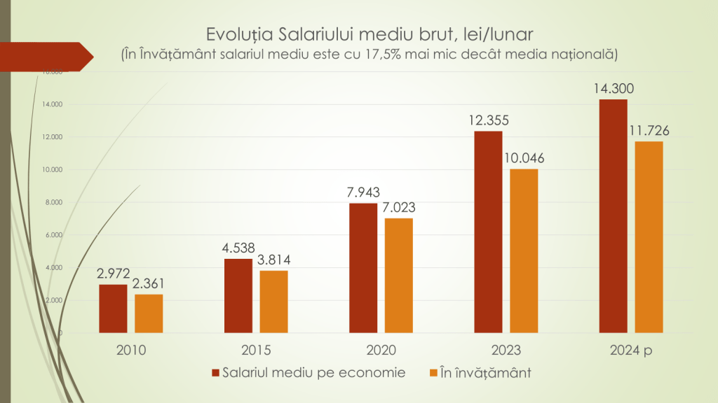 Expertul a mai afirmat că în 2010, salariul mediu pe economie era de 2972 de lei/lunar, iar cel al angajaților în învățământ – de 2361 de lei/lunar. În 2015, salariul mediu pe economie – 4538 de lei, iar cel al angajaților în învățământ – 3814 lei/lunar. În 2020, salariul mediu pe economie a ajuns 7943 de lei, iar cel al angajaților în învățământ – la 7023 de lei/lunar. În 2024, este prognozat ca salariul mediu pe economie să fie de 14300 lei/lunar, iar cel al angajaților în învățământ – 11726 lei/lunar. „Timp de 15 ani, salariul din educație este cu 17%-20% mai mic decât media națională”, afirmă expertul.