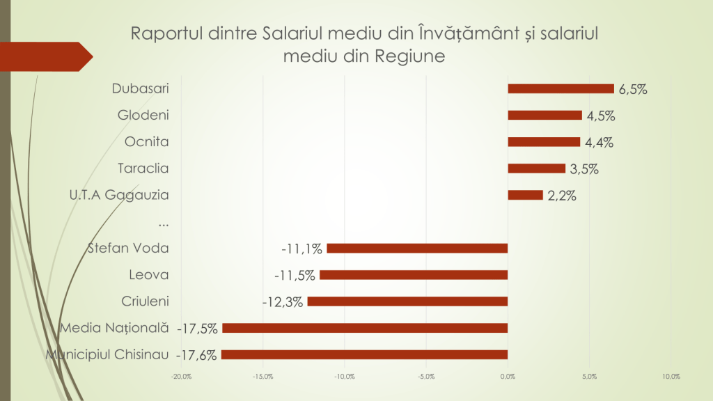 Analizând raportul dintre salariul mediu din învățământ și salariul mediu din regiune, economistul a constatat că sunt raioane unde salariul profesorilor este mai mare decât media raională. De exemplu, la Dubăsari este mai mare cu 6,5%; la Glodeni cu 4,5%; Ocnița +4,4%; Taraclia +3,5%; iar în UTA Găgăuzia +2,2%. În zonele rurale, salariul profesorilor ar fi și mai mare comparativ cu media din regiune. În prezent, în foarte multe raioane, statutul profesorului este mai bun decât alți angajați din localitatea dată, deoarece oamenii nu au alte locuri de muncă, decât cel de profesor. Însă, sunt și raioane unde salariul profesorilor este mai mic decât salariul mediu din regiune. La Ștefan Vodă este cu mai mic cu 11,1%; la Leova – minus 11,5%; Criuleni – minus 12,3%; municipiul Chișinău – minus 17,6%. Media națională este de minus 17,5%. „Problema nu este în salarizare. Cred că sunt alți factori care fac să nu avem profesori în sistemul educațional, dar și să îmbătrânească profesorii”, a conchis economistul.