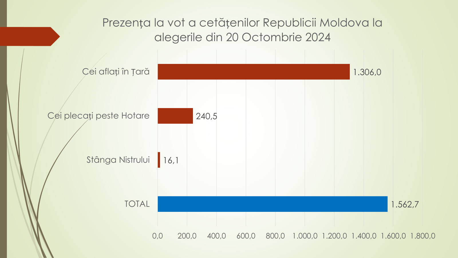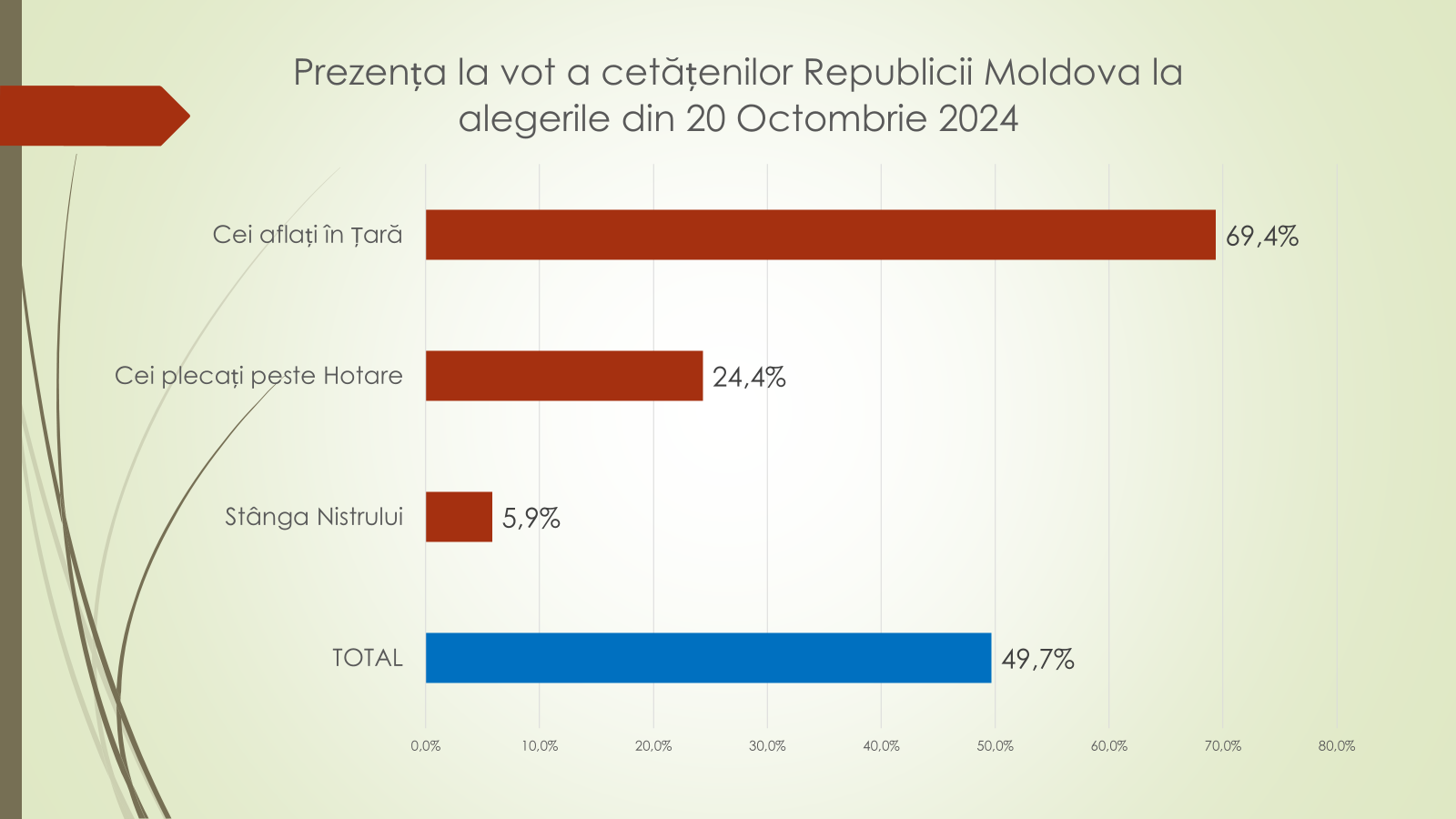 Făcând trimitere la datele Comisiei Electorale Centrale, cu referire la prezența la vot a cetățenilor Republicii Moldova, Veaceslav Ioniță a reiterat că la turul întâi al alegerilor din 20 octombrie 2024 au participat aproape 1 milion (mln) 562 de mii de moldoveni sau 49,7% din populația Republicii Moldova. Cei aflați în țară – 1 milion 306 mii sau 69,4%; cei plecați peste hotare – 240,5 mii sau 24,4%; iar cei aflați în regiunea separatistă transnistreană – 16,1 mii sau 5,9%.
