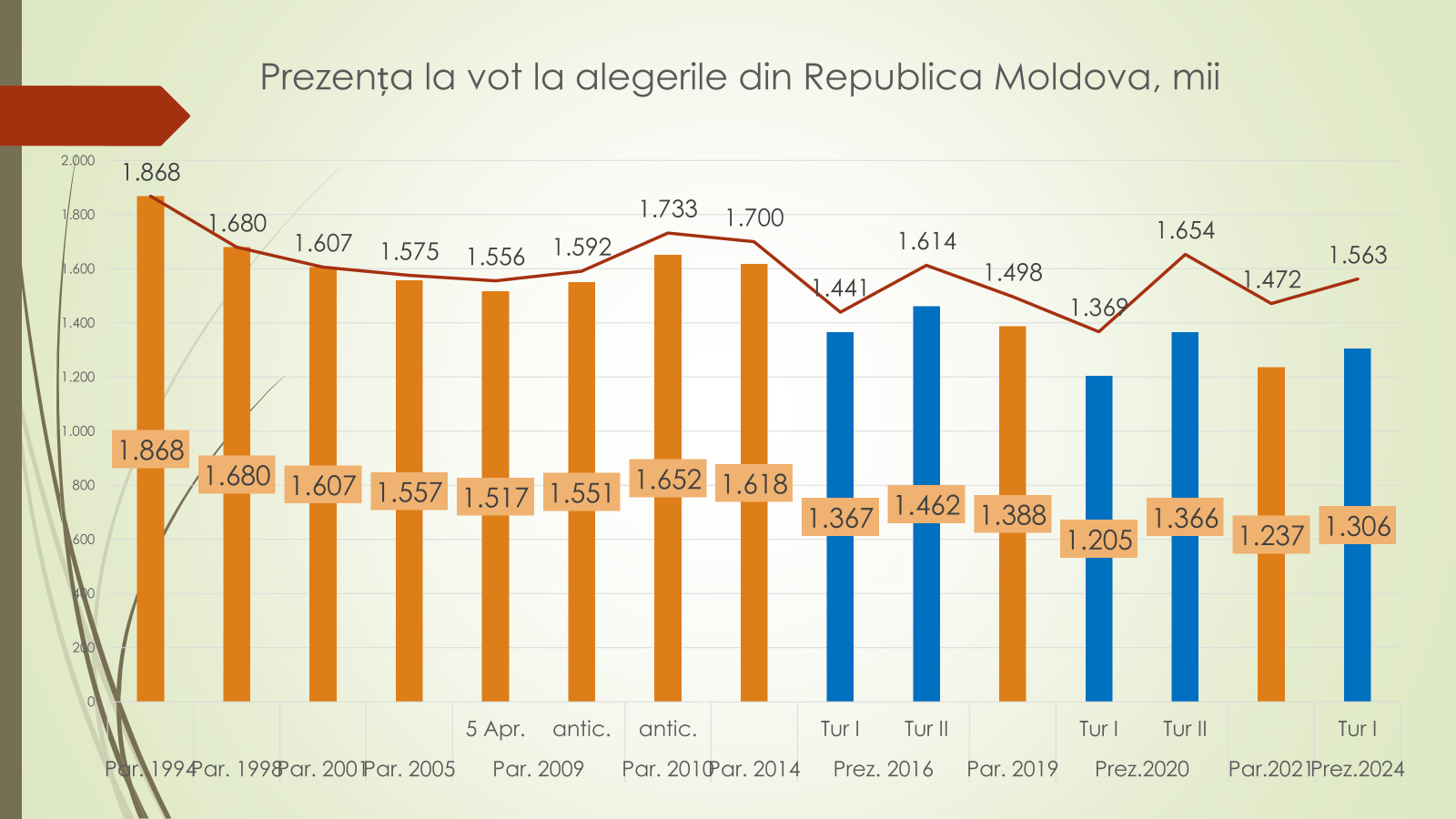 Analizând prezența la vot, în țară, la alte alegeri desfășurate, expertul constată o scădere a votanților de acasă. În baza informațiilor disponibile se poate spune că la alegerile parlamentare din 1994 au participat 1 mln și 86 de mii de moldoveni aflați în țară. În 1998 – 1 mln 68 de mii de moldoveni de acasă. 2001 – 1 mln 60 de mii. În 2005 au mers la urne 1 mln și 57 de mii, dintre care 1 mln și 55 de mii au fost voturile celor de acasă. În 2009 – 1 mln 55 de mii, dintre care 1 mln și 51 de mii voturile exprimate în țară. Tot 2009, dar la anticipate deja – 1 mln 59 de mii, dintre care 1 mln și 55 de mii au fost voturile celor de acasă. În 2010 – 1 mln și 73 de mii, iar 1 mln și 65 de mii au fost voturile pe țară). 2014 – 1 mln 70 de mii (1 mln 61 de mii-voturi în țară). 2016: turul I – 1 mln 44 de mii (1 mln 36 de mii-voturi în țară), turul II – 1 mln 61 de mii (1 mln 46 de mii-voturile celor de acasă). 2019 – 1 mln 49 de mii (1 mln 38 de mii-voturi în țară); 2020, turul I – 1 mln 36 de mii (1 mln 20 de mii-voturile moldovenilor de acasă), turul II – 1 mln 65 de mii (1 mln 36 de mii-voturile din țară). 2021 – 1 mln 47 de mii (1 mln 23 de mii-voturile celor de acasă); iar 2024, turul I – 1 mln 56 de mii (1 mln 30 de mii-voturi din țară).