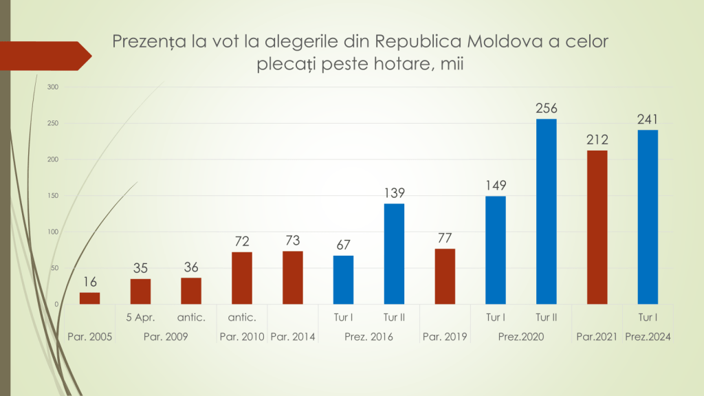 Despre prezența la vot a celor plecați peste hotare, s-a costatat că la alegerile parlamentare din 2005 au participat 16 mii de moldoveni; la parlamentarele din 2009: aprilie – 35 de mii, iulie – 36 de mii. 2010 – 72 de mii, 2014 – 73 de mii, 2016: turul I – 67 de mii, turul II – 139 de mii; 2019 – 77 de mii; 2020: turul I – 149 de mii, turul II – 256 de mii; 2021 – 212 mii; 2024: turul I – 241 de mii. „Avem în ultima perioadă o prezență spectaculoasă la vot a moldovenilor care se află peste hotare”, constată expertul.