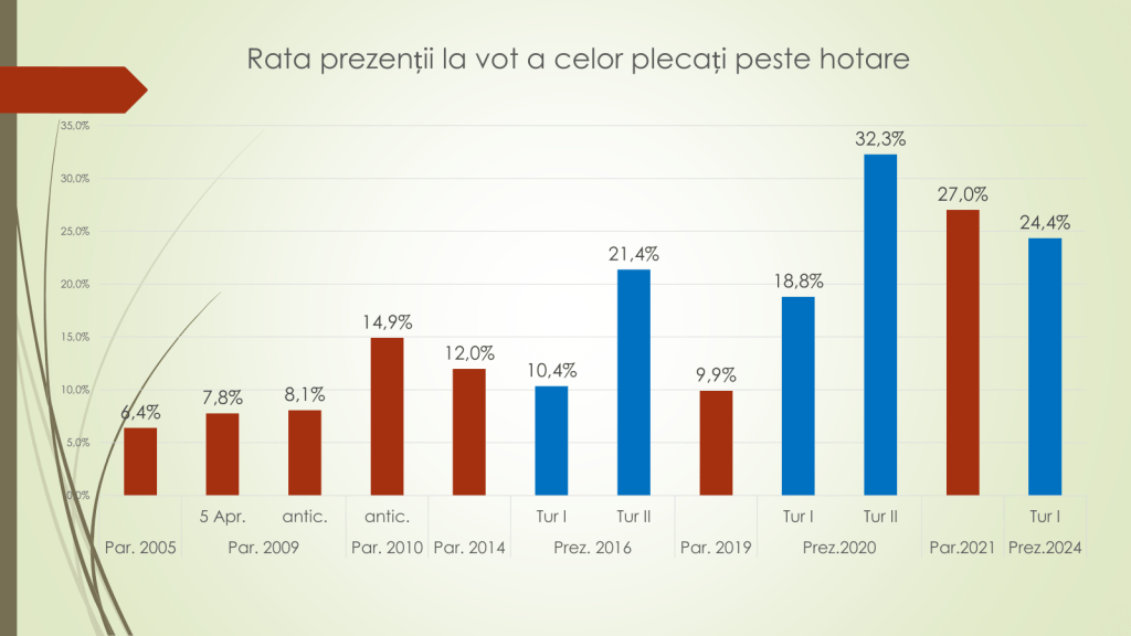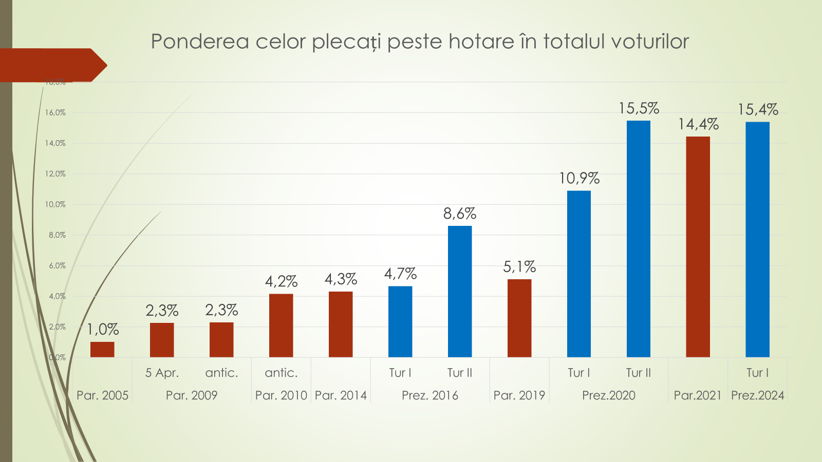 Cu referire la ponderea celor plecați peste hotare în totalul voturilor, economistul a menționat că în 2005 a fost de doar 1%; în 2009 – 2,3%; 2010 – 4,2%; 2014 – 4,3%; 2016 – turul I – 4,7%, turul II – 8,6%; 2019 – 5,1%; 2020: turul I – 10,9%, turul II – 15,5%; 2021 – 14,4%; iar în 2024, turul I – 15,4%. „Practic fiecare al șaselea vot exprimat acum a venit de peste hotare”, a mai menționat economistul.