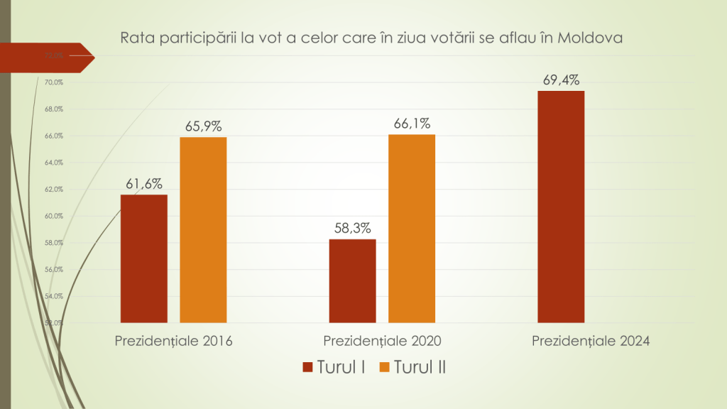 Despre rata participării la alegerile prezidențiale a celor care în ziua votării se aflau în Republica Moldova, analistul economic a afirmat că dacă în 2016, în turul I a fost de 61,6%, în turul II – 65,9%; iar în 2020: turul I – 58,3%, iar în turul II – 66,1%; atunci în 2024: turul I a crescut la 69,4%. „La aceste alegeri prezidențiale a fost înregistrată cea mai mare rată de participare a moldovenilor din ultimii zece ani, care se aflau în țară”, potrivit economistului.