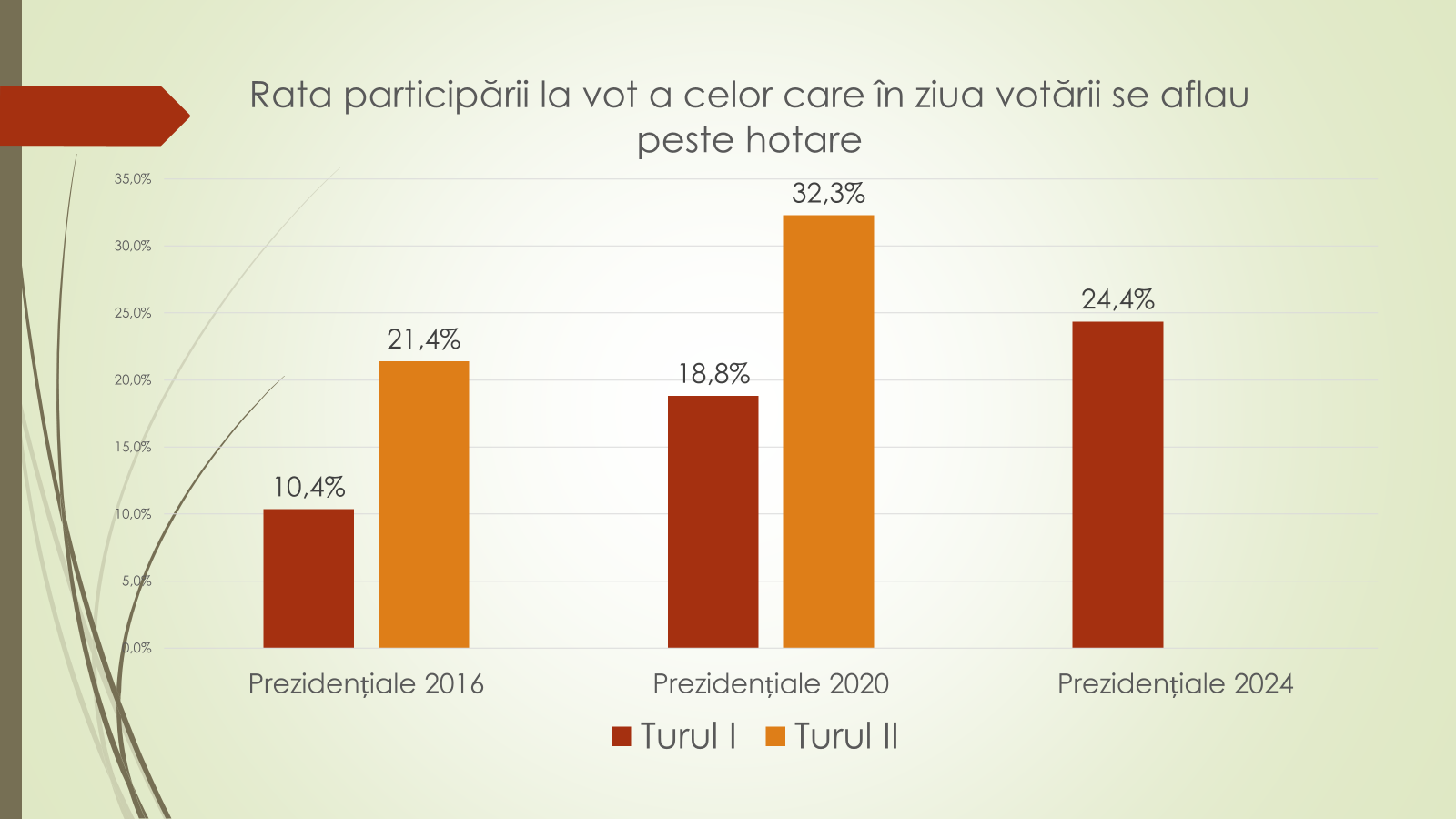 Analiza ratei participării la alegeri a celor care în ziua votării se aflau peste hotare arată că în 2016, în turul I au participat 10,4%, în turul II – 21,4%. În 2020: turul I – 18,8%, turul II – 32,3%; iar în 2024: turul I – 24,4%.