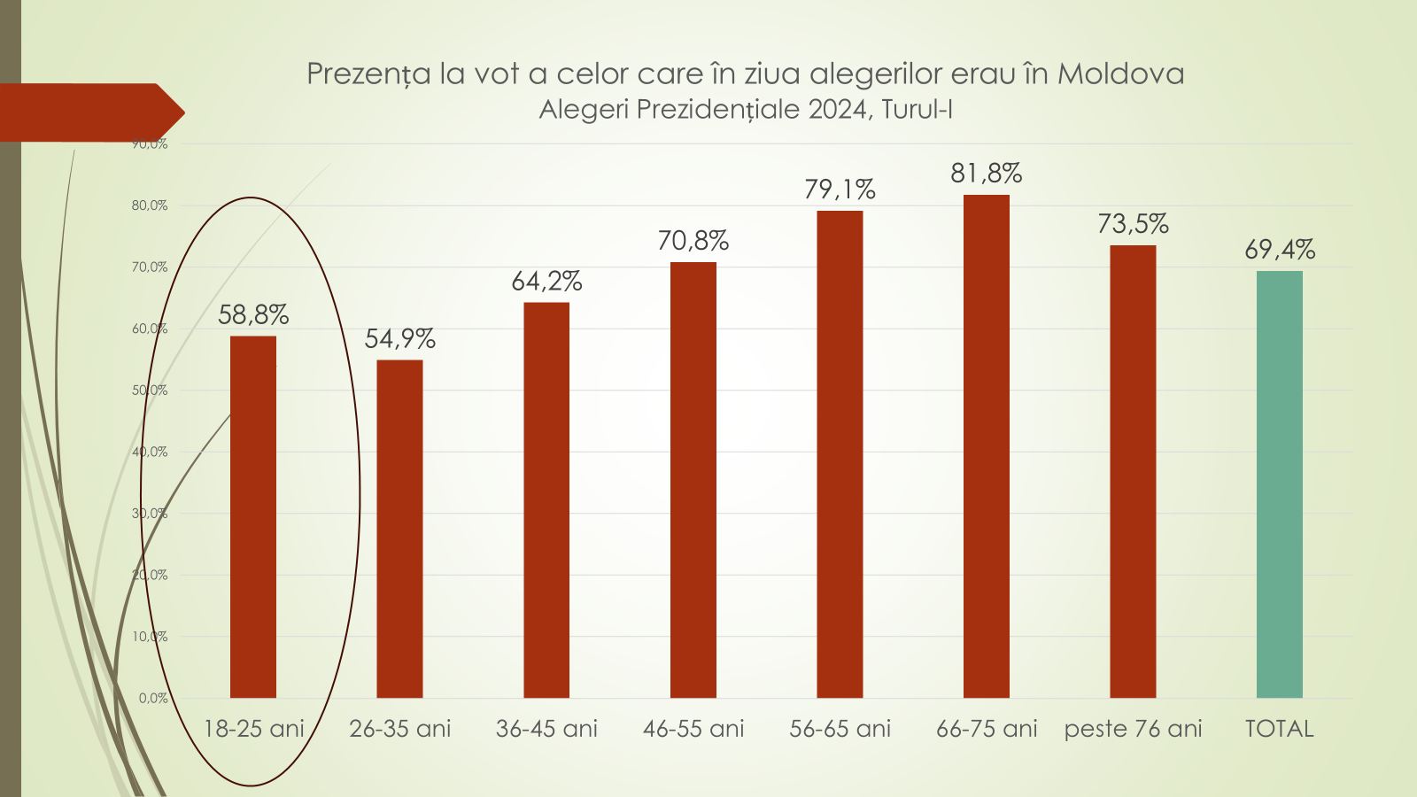 Prezența la vot a celor care duminică, 20 octombrie, erau în Republica Moldova, pe grupe de vârstă, arată că tinerii de la 18 la 25 de ani au mers în porporție de 58,8%; cei de la 26 la 35 de ani – 54,9%; 36-45 de ani – 64,2%; 46-55 de ani – 70,8%; 56-65 de ani – 79,1%; 66-75 de ani – 81,8%; peste 76 de ani – 73,5%. „Grupul de vârstă de la 66 la 75 de ani a avut cea mai bună prezență la vot. Au avut o mobilizare totală. Practic 80% dintre toți din această categorie de vârstă au ieșit la vot. Tinerii de la 18 la 25 de ani, de asemenea, au avut o prezență la vot extraordinar de bună. Circa 60%. Cel mai mult ei au fost prezenți la alegeri circa 30-40%. Am avut o mobilizare a tinerilor mult mai bună decât de obicei. Cred că nu am avut niciodată în istoria alegerilor din Republica Moldova o prezență de circa 60% a tinerilor”, a spus expertul.