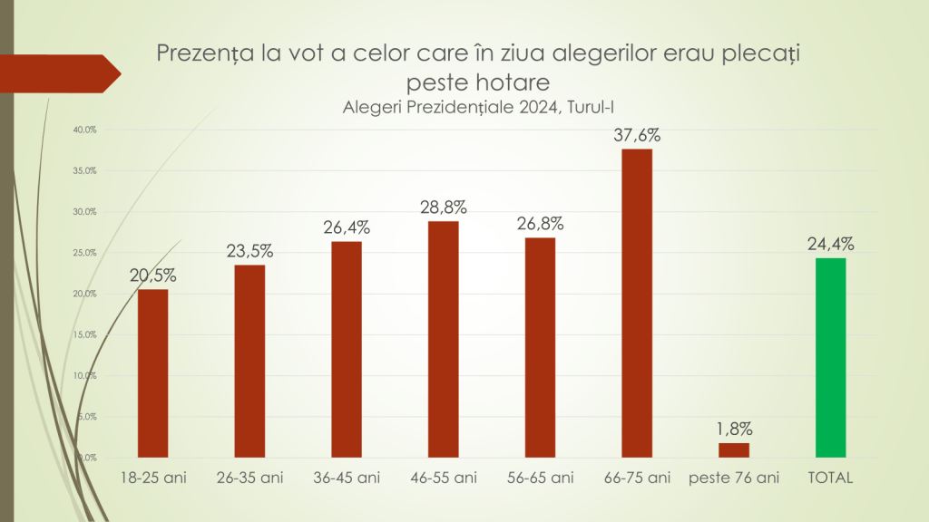 Prezența la vot a celor care duminică, 20 octombrie, erau peste hotare, pe grupe de vârstă, arată că tinerii de la 18 la 25 de ani – 20,5%; 26-35 de ani – 23,5%; 36-45 de ani – 26,4%; 46-55 de ani – 28,8%; 56-65 de ani – 26,8%; 66-75 de ani – 37,6%; iar cei de peste 76 de ani – 1,8%.