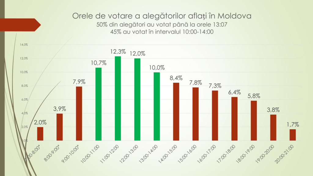 Vorbind despre orele în care procesul de votare a fost mai intens, analistul economic spune că moldovenii de acasă preferă să meargă la vot între orele 10.00 și 14.00. De la ora 07.00 și până la ora 10.00, pe oră, votează până la 10%. De la orele 10.00 și până la orele 14.00 votează, pe oră, 10-12% dintre cetățeni. De la ora 14.00 și până la orele 19.00 votează între 5% și 9%. După 19.00 și până la 21.00, votează sub 5%, pe oră. „Seara și dimineata se înregistrează cea mai slabă prezență la vot. Votul masiv începe de la 10.00 și ține până la orele 14.00”, susține analistul economic.