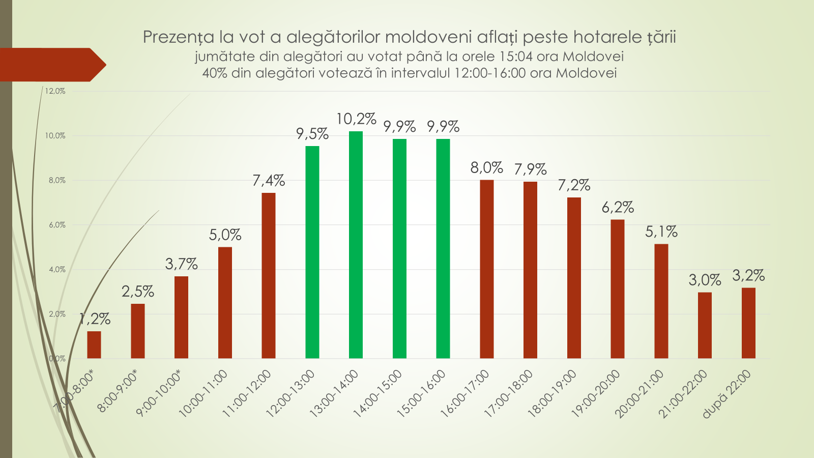 Despre prezența la vot a alegătorilor moldoveni aflați peste hotare, economistul a menționat că de la ora 07.00 și până la ora 11.00 au votat până la 5% dintre moldoveni, în fiecare oră. De la 11.00 la 12.00 – 7%. De la ora 12.00 până la la ora 16.00 au votat, pe oră, câte 9-10%. După orele 16.00 și până la închiderea secțiilor de vot, votează, în general, pe oră, sub 8%.