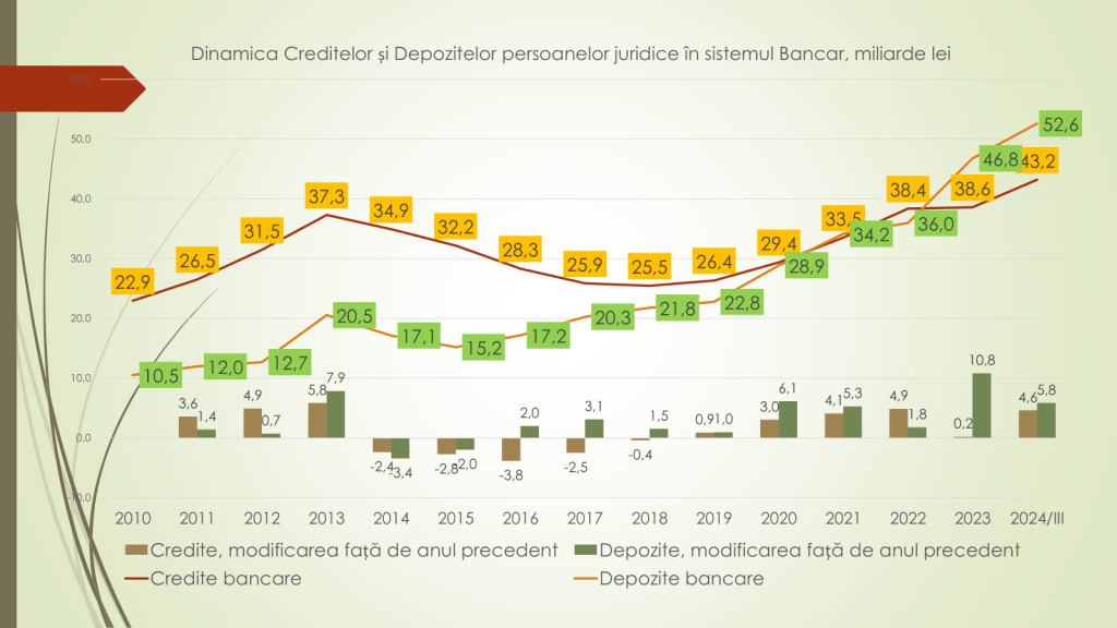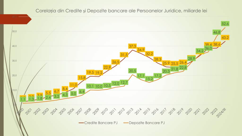 Făcând o corelație între creditele și depozitele bancare ale persoanelor juridice, analistul economic a afirmat că în 2005 sau luat credite de 8,4 mild/lei, iar depozitele făcute au fost de 4,3 mild/lei. În 2010, credite – 22,9 mild/lei, iar depozite – 10,5 mild/lei. 2013: credite – 37,3 mild/lei, depozite – 20,5 mild/lei. 2018: credite – 25,5 mild/lei, depozite – 21,8 mild/lei. 2023: credite – 38,6 mild/lei; depozite – 46,8 mild/lei. 2024, primele nouă luni: credite – 43,2 mild/lei, depozite – 52,6 mild/lei. „Din 2023, volumul depozitelor crește constant. Agenții economici nu se creditează, cu banii proprii nu știu ce să facă și îi duc la bănci. Creditele au crescut și ele, dar mult mai lent decât depozitele. Pentru prima dată acest fenomen a fost vizibil în 2021. În 2023 s-a repetat și în 2024 se repetă”, a afirmat analistul economic.