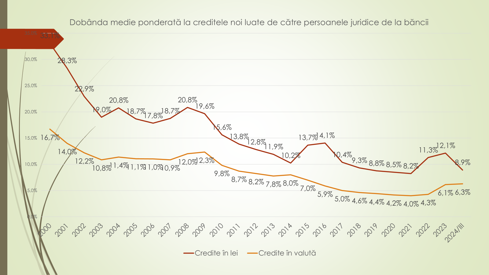 Referindu-se la dobânda medie a creditelor noi luate de către persoanele juridice de la băncii, expertul a declarat că în 2000, creditele în lei aveau o dobândă de 33,1%, iar cele în valută – 16,7%. 2003: creditele în lei – 19%, iar creditele în valută – 10,8%. 2006: creditele în lei – 17,8%, cele în valută – 11%. 2008: creditele în lei – 20,8%, în valută – 12%. 2014: creditele în lei – 10,2%, iar în valută – 8%. 2016: creditele în lei – 14,1%, cele în valută – 5,9%. 2021: creditele în lei – 8,2%, creditele în valută – 4%. 2023: creditele în lei – 12,1%, în valută – 6,1%. 2024: primele nouă luni: creditele în lei – 8,9%, în valută – 6,3%. „Scăderea dobânzii la creditele în lei a accelerat creditarea, dar depozile totuși sunt mai mari”, a spus expertul.