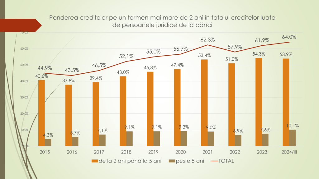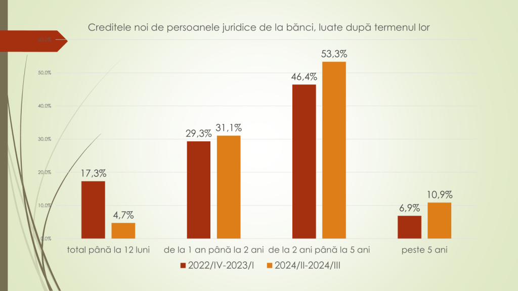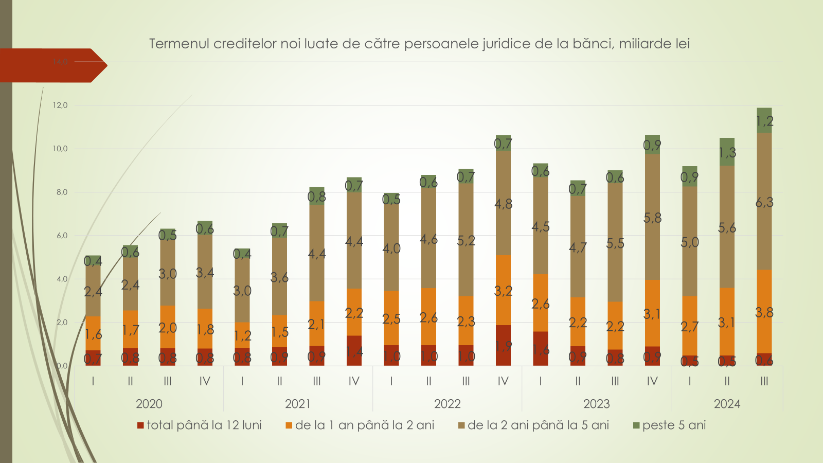 Analizând termenul creditelor noi luate de către persoanele juridice de la bănci, Veaceslav Ioniță a declarat că în 2020, creditele luate pe un termen mai mare de 5 ani au fost de 2,1 mild/lei; de până la 12 luni – 3,1 mild/lei; de la 1 la 2 ani – 7,1 mild/lei; iar de la 2 la 5 ani – 11,2 mild/lei. În 2024, în primele nouă luni: până la 12 luni – 1,6 mild/lei; peste 5 ani – 3,4 mild/lei; de la 1 la 2 ani – 9,6 mild/lei; iar de la 2 la 5 ani – 16,9 mild/lei. „Creditele luate până la un an practic dispar. Au crescut brusc, la sfârșitul lui 2022, începutul lui 2023, pe fundalul crizei de atunci. Agenții economici s-a împrumutat pe termen scurt. Acum, creditele luate pe un termen mai mare de cinci ani înregistrează creșteri. Acestea sunt credite investiționale. Agenții economici, timid, înclină spre credite investiționale”, a declarat economistul.