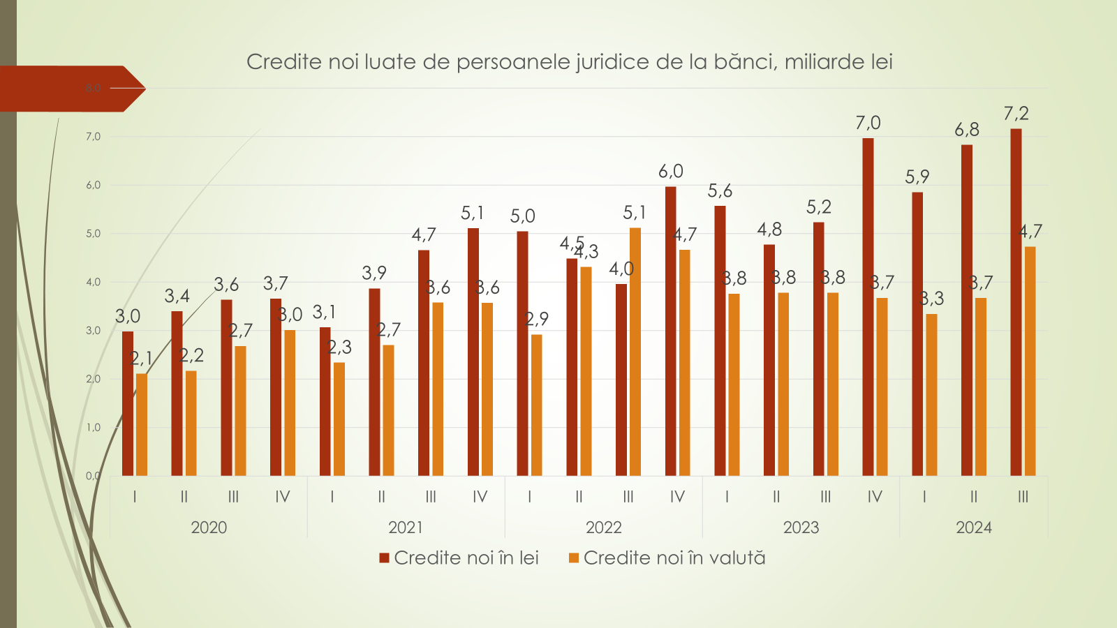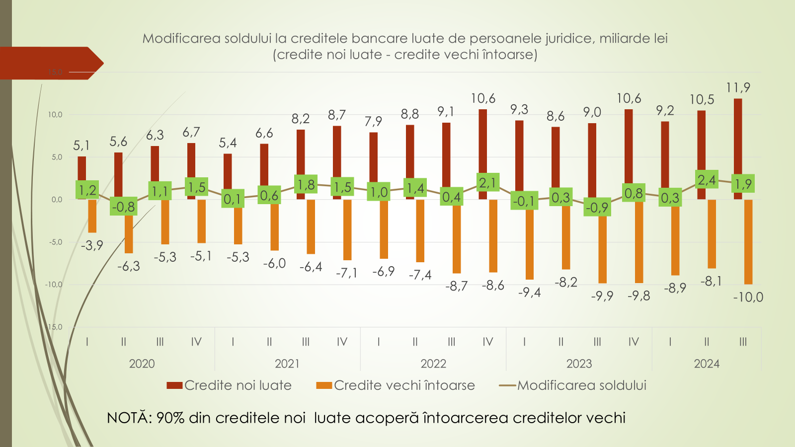 Despre modificarea soldului creditelor bancare, accesate de către persoanele juridice, expertul a declarat că în 2020 s-au luat credite noi de 23,7 mild/lei, iar suma creditelor vechi întoarse a fost de 20,6 mild/lei. În 2021, suma creditelor noi luate a totalizat 28,9 mild/lei, iar a creditelor vechi întoarse – 24,8 mild/lei. În 2022: credite noi luate – 36,4 mild/lei, iar creditele vechi întoarse – 31,6 mild/lei. 2023: credite noi – 37,5 mild/lei, iar credite vechi întoarse – 37,3 mild/lei. În 2024, în primele nouă luni: credite noi – 31,6 mild/lei, iar credite vechi întoarse – 27 mild/lei. „90% din creditele noi luate practic acoperă întoarcerea creditelor vechi. Din 2020 și până în prezent, mediul de afaceri a luat credite noi de 157,5 mild lei și au întors credite vechi de 141,3 mild lei. Creditarea reală a fost de 16,2 mild/lei”, a declarat expertul.