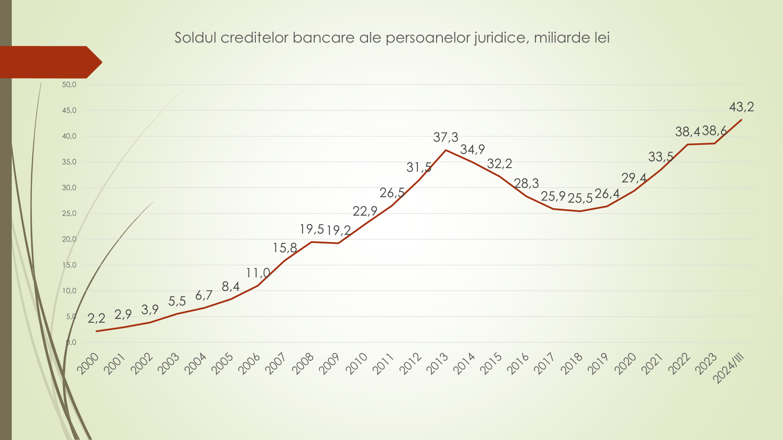Cu referire la soldul creditelor bancare ale persoanelor juridice, analistul economic a menționat că în 2000 acesta a fost de 2,2 mild/lei. În 2005 – 8,4 mild/lei. 2010 – 22,9 mild/lei. 2013 – 37, 3 mild/lei. 2018 – 25,5 mild/lei. 2020 – 29,4 mild/lei. 2023 – 38,6 mild/lei. 2024, primele nouă luni – 43,2 mild/lei.