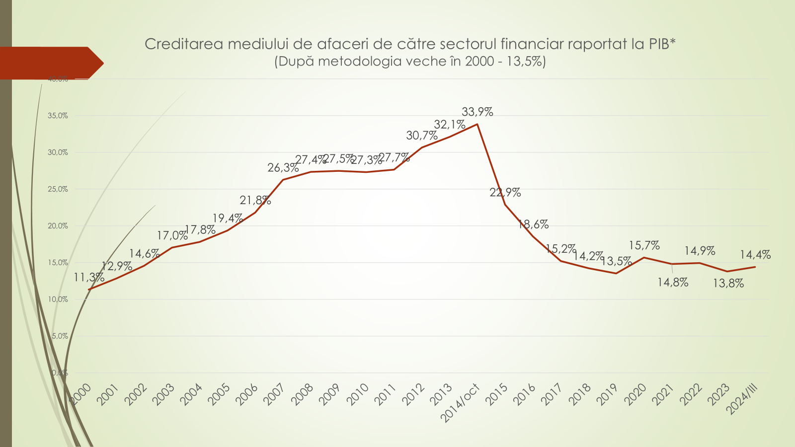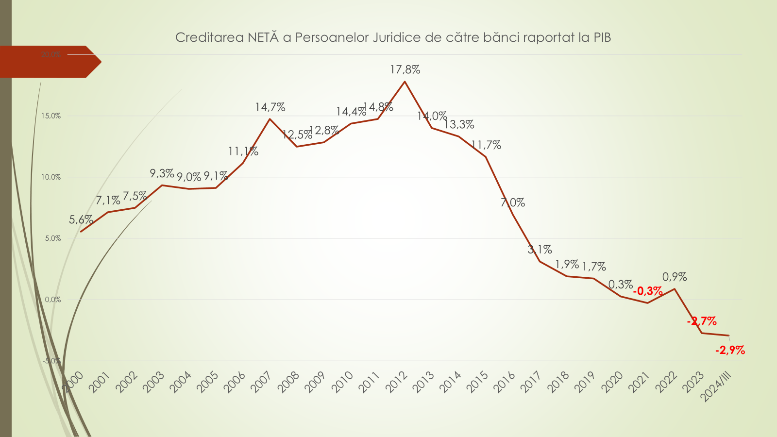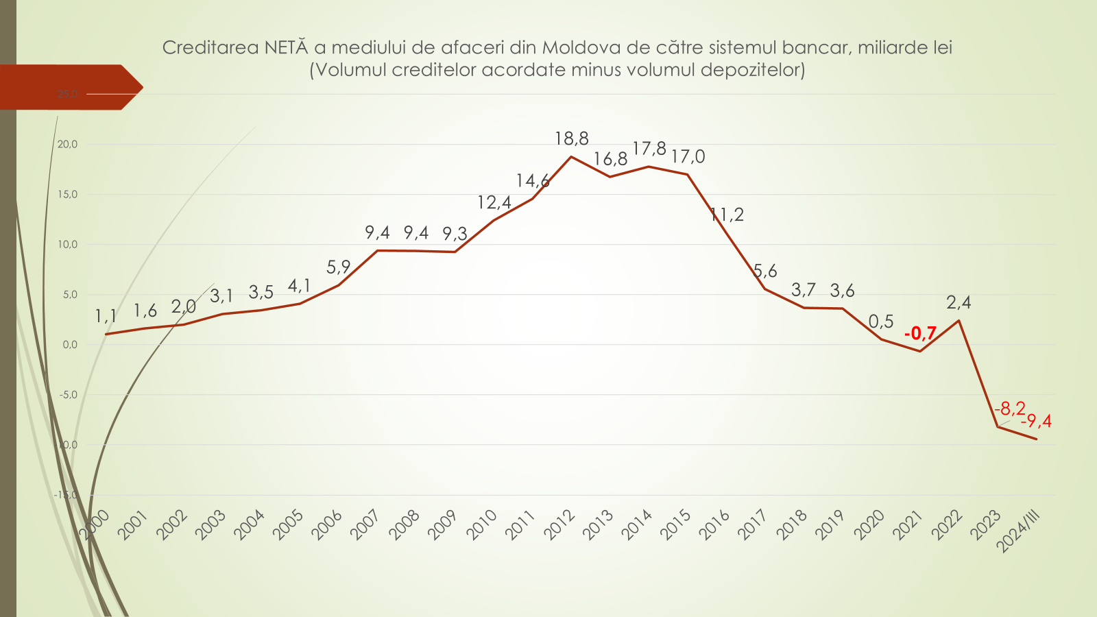 Raportat la PIB, creditarea netă a persoanelor juridice de către bănci în 2000 a fost de 5,6%; în 2005 – 9,1%; 2007 – 14,7%; 2008 – 12,5%; 2010 – 12,8%; 2012 – 17,8%; 2015 – 11,7%; 2020 – 0,3%; 2022 – 0,9%; 2024, estimat – minus 2,9%. „Maxima a fost atinsă în 2012. De atunci suntem în cădere, iar din 2021 avem o situație fără precedent. Creditarea netă a businessului este negativă. Nu știu dacă undeva în lume mai este așa ceva”, a mai menționat economistul.