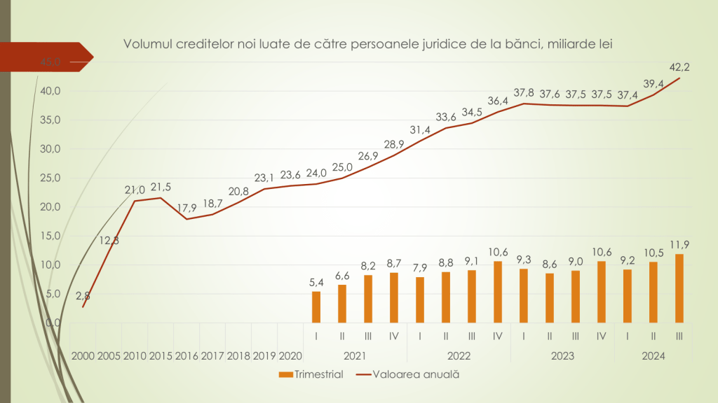 Analizând volumul creditelor noi accesate, de la bănci, de către persoanele juridice, expertul a spus că în 2000 acesta era de 2,8 miliarde de lei (mild/lei), în 2005 – 12,3 mild/lei; 2015 – 21,5 mild/lei; 2020 – 23,6 mild/lei; 2023 – 37,5 mild/lei; iar în 2024, primele nouă luni – 31,6 mild/lei. „În cele trei trimestre, volumul creditelor contractate de către companiile moldovenești au atins un record fără precedent în istoria țării – 31,6 mild/lei. În valoare anuală, a depășit cifra de 42,2 mild/lei. Așa ceva nu a fost niciodată. Până în 2010, creditarea a ajuns la 21 mild/lei. Apoi, zece ani, creditarea nu a depășit 23 mild/lei anual. A crescut, din 2020 și până la jumătatea lui 2022, la 36 mild/lei. De atunci și până la începutul anului curent, s-a stat la nivelul de 37 mild/lei, iar de la începutul anului avem o accelerare”, a spus expertul.