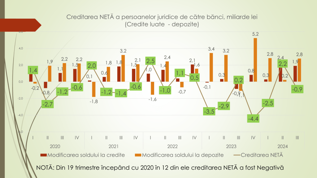 Cu referire la creditarea netă a mediului de afaceri de către bănci, Veaceslav Ioniță a menționat că agenții economici, au luat în trimestrul trei din 2024 credite în valoare de 11,9 mild/lei, au întors credite vechi de 10 mild/lei și au făcut depozite bancare de 2,8 mild/lei. Astfel, creditarea netă a fost negativă. „Au luat credite de 11,9 mild/lei, au întors băncilor pentru creditele vechi 10 mild/lei și au făcut depozite la bănci de 2,8 mild/lei. Ei au luat din bănci 11,9 mild/lei, dar au dus la bănci 12,8 mild/lei. Creditarea netă a fost negativă. Cifra impresionantă de 11,9 mild/lei, din trimestrul trei, nu spune nimic dacă nu ne uităm la depozitele pe care le-au făcut agenții economici. Din cele 19 trimestre, din 2020 și până în prezent, în 12 trimestre creditarea netă a agenților economici a fost negativă. Ei au dus mai mulți bani la bănci decât au luat credite. Indicatorul care ne arată situația din economie nu este volumul de credite noi luate, nu este soldul creditelor noi luate, dar este creditarea netă”, a declarat Veaceslav Ioniță.
