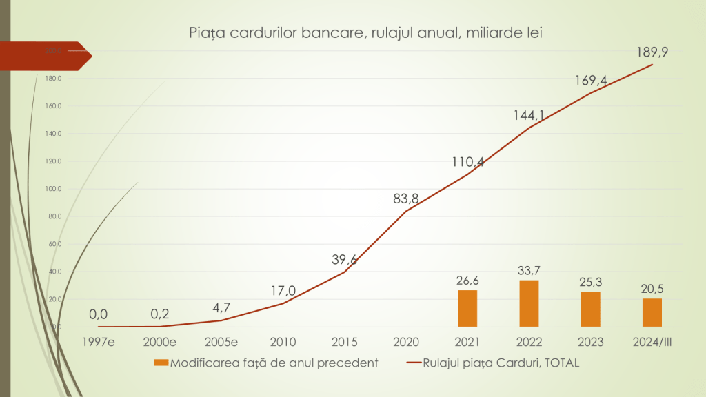 Potrivit expertului, în 2015, piața cardurilor bancare a avut o creșterea anuală de 7,2 mild/lei, dintre care: 5,6 mild/lei-retragere numerar, iar 1,6 mild/lei-plăți cu cardul. În 2019, creșterea anuală a fost de 12,9 mild/lei, dintre care: 7,3 mild/lei-retragere numerar, iar 5,6 mild/lei-plăți cu cardul. 2020, an de pandemie – creșterea anuală a pieței cardurilor a fost de 5,8 mild/lei, dintre care: 2 mild/lei-retragere numerar, iar 3,8 mild/lei-plăți cu cardul. 2022 – creștere anuală de 33,7 mild/lei: 16,3-retragere numerar, iar 17,4 mild/lei-plăți cu cardul. 2023 – creștere anuală de 25,4 mild/lei: 8,7 mild/lei-retragere numerar, iar 16,7 mild/lei-plăți cu cardul. 2024, trimestru trei – creștere anuală de 20,4 mild/lei: 5,1 mild/lei-retragere numerar, iar 15,3 mild/lei-plăți cu cardul.