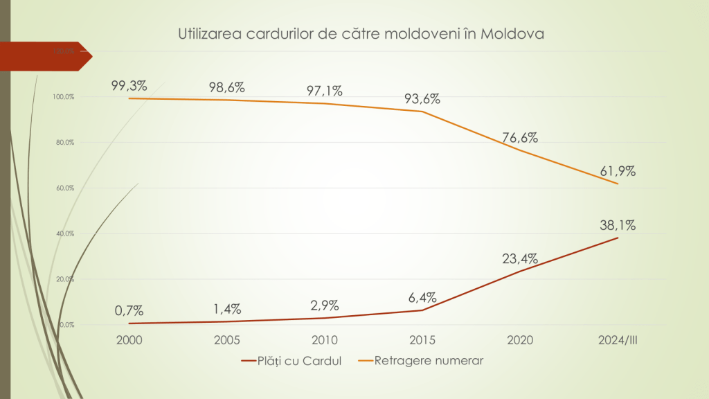 Cu referire la utilizarea cardurilor de către moldoveni în Republica Moldova, economistul susține că 2000, doar 0,7% erau plățile cu cardul, iar 99,3%-retragerile de numerar. În 2005: 1,4% au fost plățile cu cardul, iar 98,6%-retragerile în numerar. 2010: 2,9%-plățile cu cardul, iar 97,1%-retragerile de numerar. 2015: 6,4%-plățile cu cardul, iar 93,6%-retragerile în numerar. 2020: 23,4%-plățile cu cardul, iar 76,6%-retragerile în numerar. 2024, trimestrul trei: 38,1%-plățile cu cardul, iar 61,9%-retragerile de numerar.