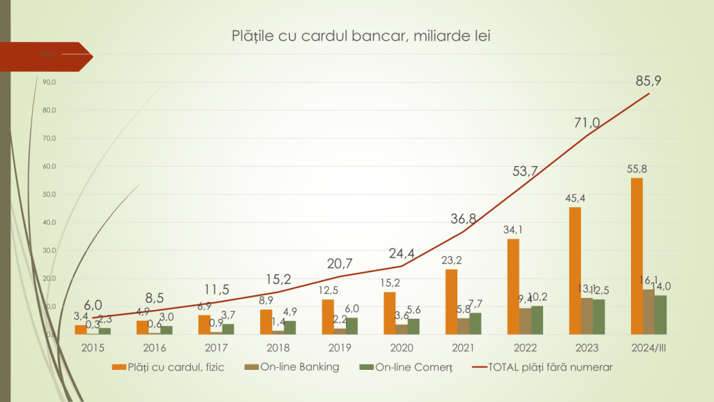 Despre plățile cu cardul bancar, analistul economic afirmă că 2015 acestea au fost de 6 mild/lei, dintre care 3,4 mild/lei-plățile cu cardul, 2,3 mild/lei-comerțul online, iar 0,3 mild/lei-bankingul online. În 2020 – 24,4 mild/lei: 15,2 mild/lei-plățile cu cardul, 5,6 mild/lei-comerțul online, iar 3,6 mild/lei- bankingul online. 2022 – 53,7 mild/lei: 34,1 mild/lei-plățile cu cardul, 10,2 mild/lei-comerțul online, iar 9,4 mild/lei-bankingul online. 2024, trimestrul trei – 85,9 mild/lei: 55,8 mild/lei-plățile cu cardul, 16,1 mild/lei-bankingul online, iar 14 mild/lei-comerțul online. „O creștere de 15 ori în zece ani. Foarte rapid, că este comod, a început să fie utilizat bankingul pentru achitarea online a facturilor. Comerțul online, la fel, crește destul de rapid”, a afirmat analistul economic.