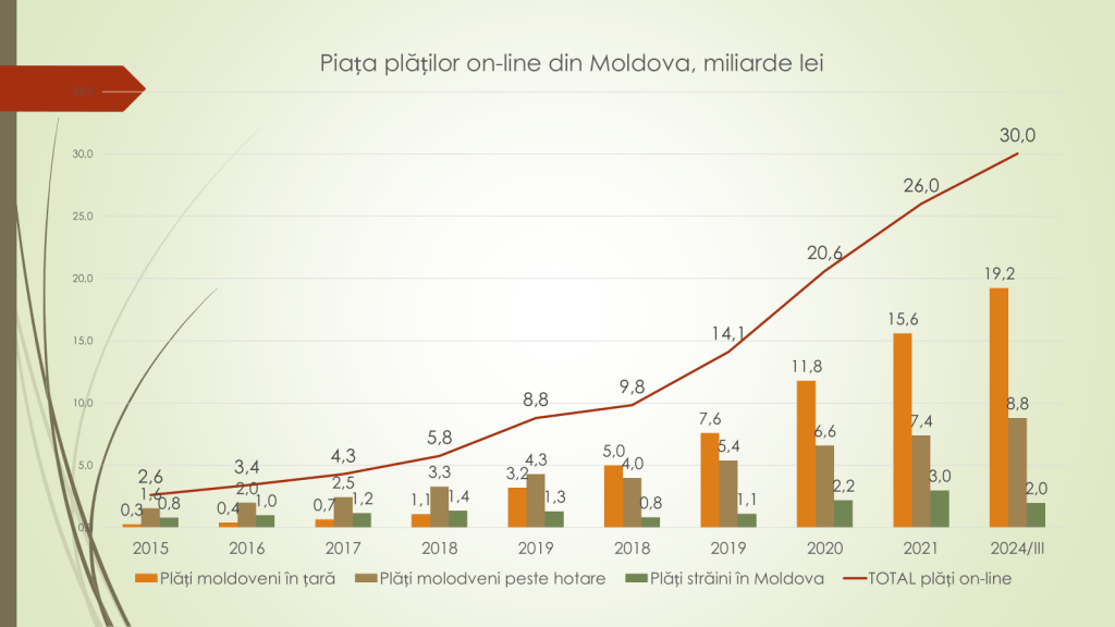 Referitor la piața plăților online, expertul a menționat că în 2015 a totalizat 2,7 mild/lei, dintre care 1,6 mild/lei-plăți ale moldovenilor peste hotare, 0,8 mild/lei-plăți ale străinilor în Moldova, iar 0,3 mild/lei-plăți ale moldovenilor în țară. În 2020 a ajuns la 20,6 mild/lei, dintre care: 11,8 mild/lei-plăți ale moldovenilor în țară, 6,6 mild/lei-plăți ale moldovenilor peste hotare, iar 2,2 mild/lei-plăți ale străinilor în Moldova. 2024, trimestrul trei – 30 mild/lei: 19,2 mild/lei-plăți ale moldovenilor în țară, 8,8 mild/lei-plăți ale moldovenilor peste hotare, iar 2 mild/lei-plăți ale străinilor în Moldova.