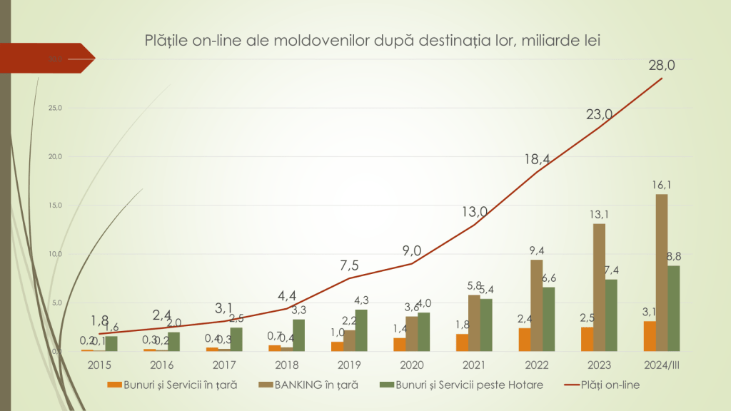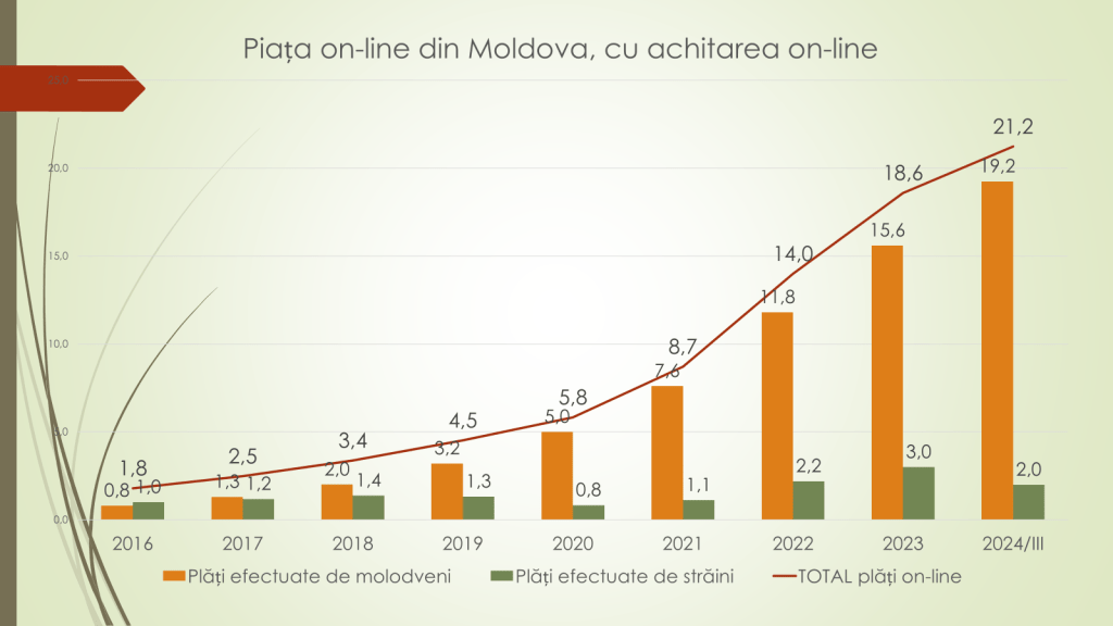 Potrivit expertului, piața online, cu achitarea online, în 2016 a fost de 1,8 mild/lei, dintre care 1 mild/lei-plăți efectuate de către străini, iar 0,8 mild/lei-plăți efectuate de către moldoveni. 2020 – 5,8 mild/lei: 5 mild/lei-plăți efectuate de către moldoveni, iar 0,8 mild/lei-plăți efectuate de către străini. 2024, trimestrul trei – 21,2 mild/lei: 19,2 mild/lei-plăți efectuate de către moldoveni, iar 2 mild/lei-plăți efectuate de către străini. „Achitările online au crescut brusc după 2020. Pandemia a învățat moldovenii să facă achitările online”, a declarat expertul.
