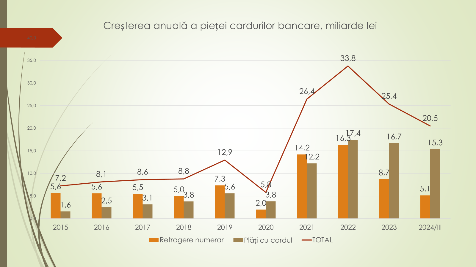 Potrivit expertului, în 2015, piața cardurilor bancare a avut o creșterea anuală de 7,2 mild/lei, dintre care: 5,6 mild/lei-retragere numerar, iar 1,6 mild/lei-plăți cu cardul. În 2019, creșterea anuală a fost de 12,9 mild/lei, dintre care: 7,3 mild/lei-retragere numerar, iar 5,6 mild/lei-plăți cu cardul. 2020, an de pandemie – creșterea anuală a pieței cardurilor a fost de 5,8 mild/lei, dintre care: 2 mild/lei-retragere numerar, iar 3,8 mild/lei-plăți cu cardul. 2022 – creștere anuală de 33,7 mild/lei: 16,3-retragere numerar, iar 17,4 mild/lei-plăți cu cardul. 2023 – creștere anuală de 25,4 mild/lei: 8,7 mild/lei-retragere numerar, iar 16,7 mild/lei-plăți cu cardul. 2024, trimestru trei – creștere anuală de 20,4 mild/lei: 5,1 mild/lei-retragere numerar, iar 15,3 mild/lei-plăți cu cardul.