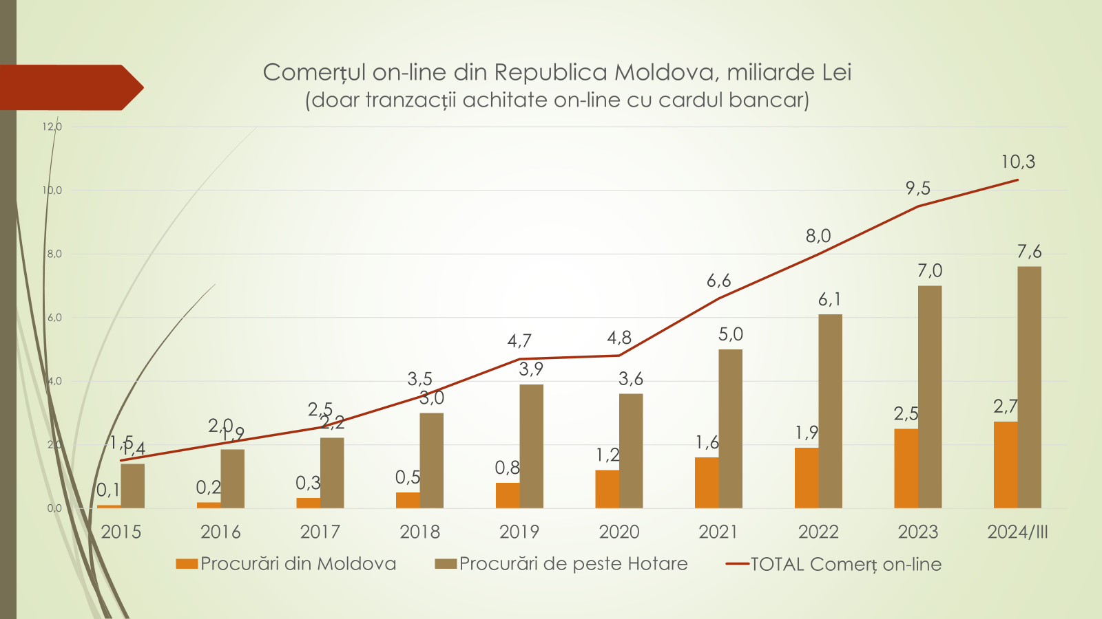Potrivit expertului, piața online, cu achitarea online, în 2016 a fost de 1,8 mild/lei, dintre care 1 mild/lei-plăți efectuate de către străini, iar 0,8 mild/lei-plăți efectuate de către moldoveni. 2020 – 5,8 mild/lei: 5 mild/lei-plăți efectuate de către moldoveni, iar 0,8 mild/lei-plăți efectuate de către străini. 2024, trimestrul trei – 21,2 mild/lei: 19,2 mild/lei-plăți efectuate de către moldoveni, iar 2 mild/lei-plăți efectuate de către străini. „Achitările online au crescut brusc după 2020. Pandemia a învățat moldovenii să facă achitările online”, a declarat expertul.