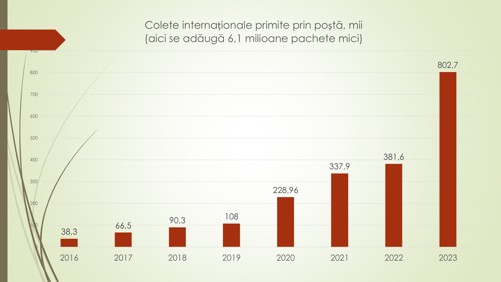 Veaceslav Ioniță spune că atunci când vorbim despre piața online este vorba și de colete internaționale primite prin poștă. Astfel, în 2016 moldovenii au primit 38,3 mii de colete; în 2018 au recepționat 90,3 mii; în 2020 – 228,9 mii; 2022 – 381,6 mii; iar în 2023 – 802,7 mii de colete.