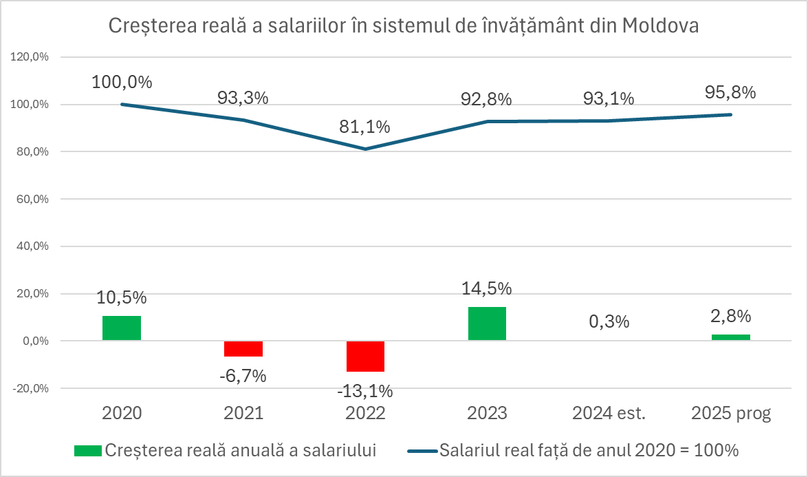 Dacă ținem cont de inflația care a accelerat în ultimele luni, majorarea de 9% nu va aduce nicio îmbunătățire reală. În schimb, salariile reale ale profesorilor în 2025 vor continua să scadă, fiind mai mici decât în 2020.