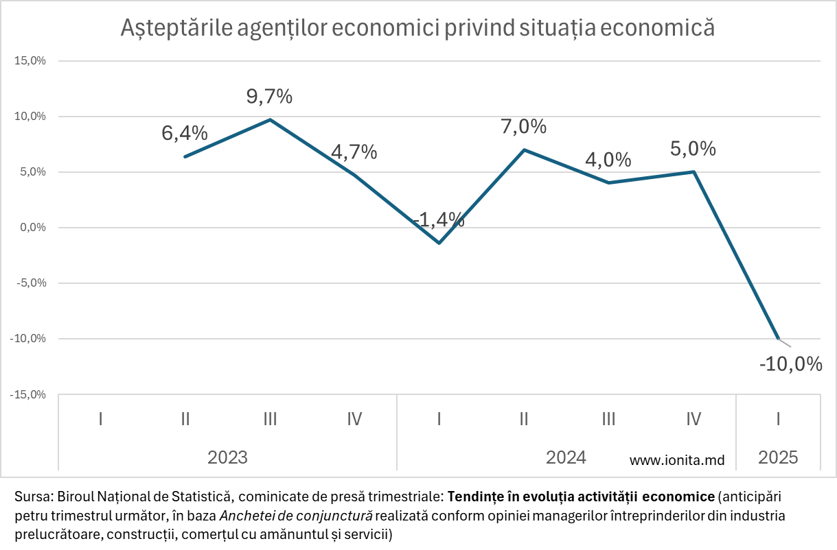 1. […] Așteptările mediului de afaceri pentru primul trimestru din 2025 sunt cele mai pesimiste de la debutul măsurătorilor, conform datelor publicate de Biroul Național de Statistică. Se estimează o scădere economică de -10%, o prognoză mult mai negativă decât scăderea de -1,4% înregistrată în aceeași perioadă a anului trecut, scrie expertul economic Veaceslav Ioniță pe blogul său.  […]